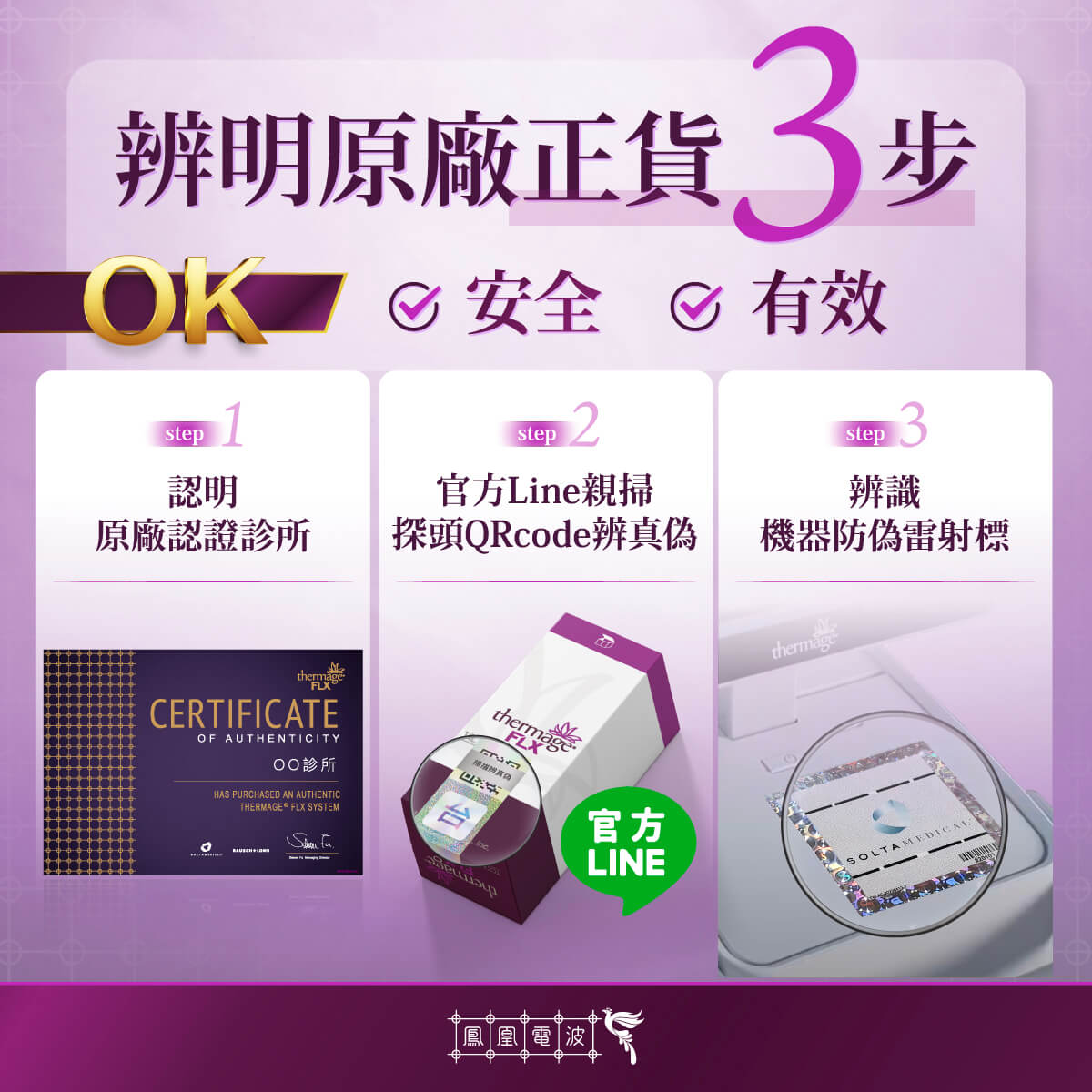 醫療器材僅限於合法醫療場所並由專業合法醫師執行醫療行為,如若由非專業醫師進行操作,恐導致術後不良反應甚至嚴重燙傷。療程前,建議民眾應謹慎辨識醫療產品來源與合法性。記者進一步求證原廠,詢問正確辨別原廠正貨的方式,建議民眾可自網站查詢原廠認證診所,可初步判斷診所機器是否來自原廠合法管道,並主動認明機器及探頭防偽標籤、親自拆封探頭,確保為未拆封探頭以官方LINE掃描防偽標籤QR code辨識產品真偽,才能維護自身醫療權益與療程安全。