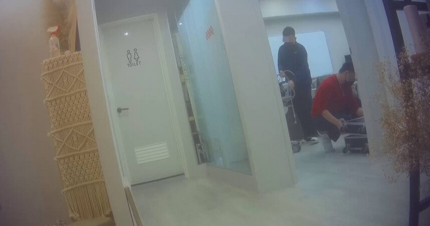 號稱年度最優惠的鳳凰電波團在北市信義區租借美容室小房間違法施打,負責人B男(右)和1名技師(左)合力擺放設備。(圖/本刊攝影組)