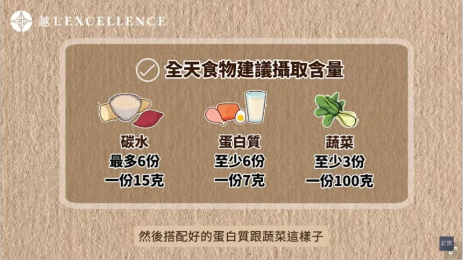 ▲一天碳水、蛋白質及蔬菜建議攝取量。(圖/翻攝越診所YouTube)