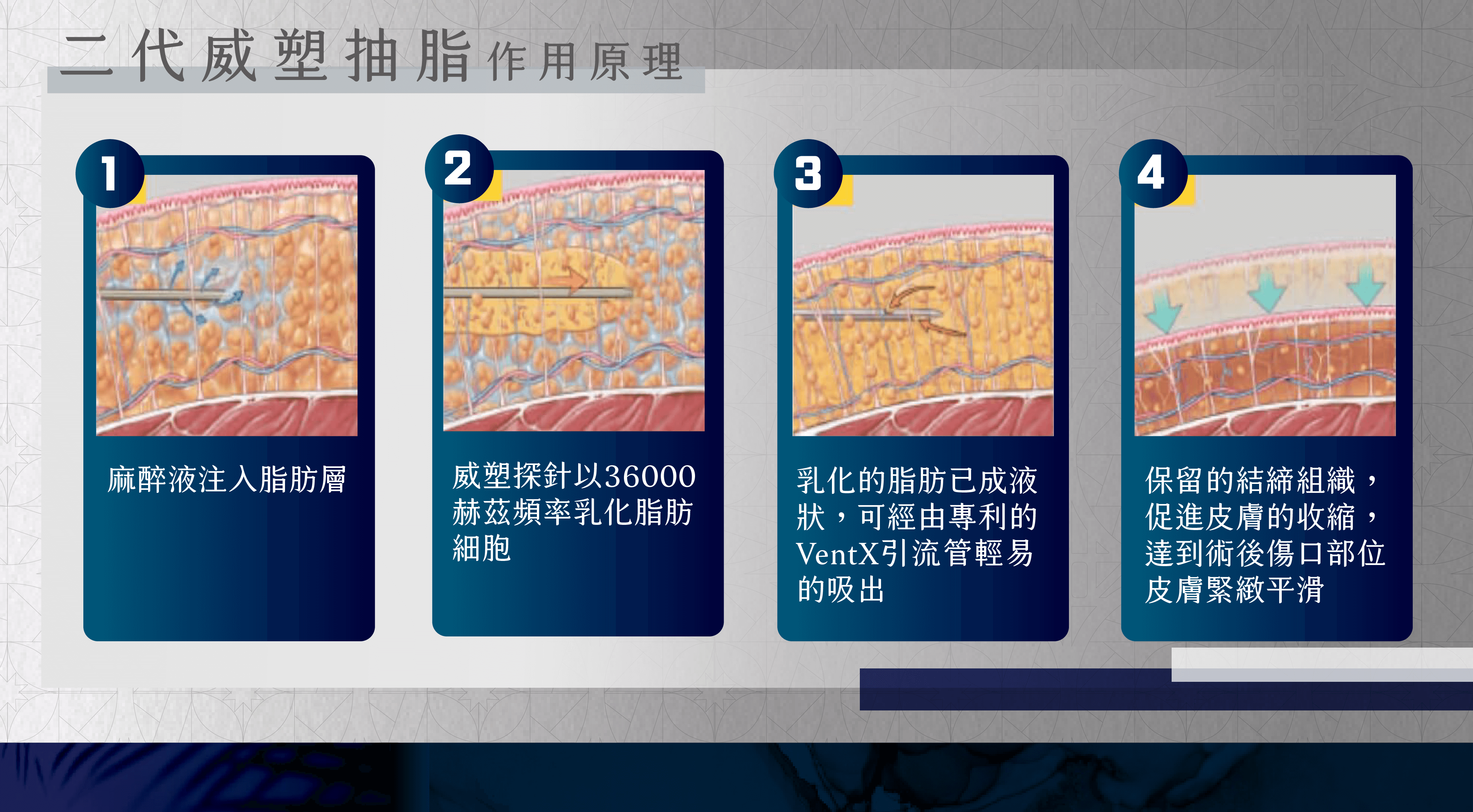 威塑是目前最新穎的抽脂儀器,利用專利鈦金屬探針釋放固定頻率36000赫茲音波,產生數百個綿密氣泡,音波氣泡分散把較大的脂肪團塊分離成小的脂肪團塊,經過螺旋水流再將小脂肪團塊分離為顆顆分明的脂肪細胞,乳麋後保留結締組織,使術後緊致,Vaser是目前市面上唯一具有脂肪選擇性的抽脂技術。