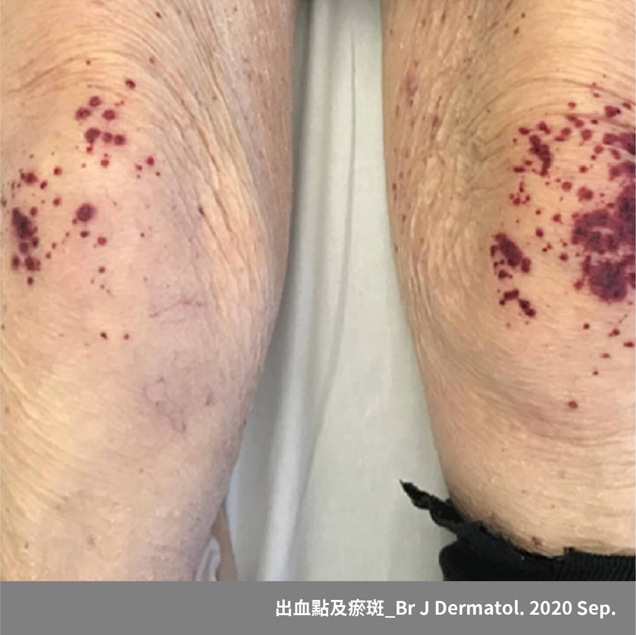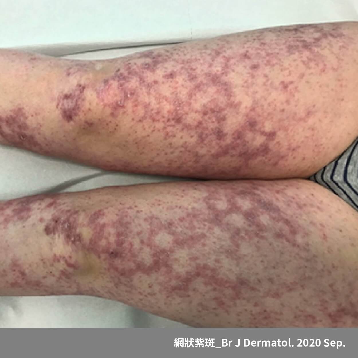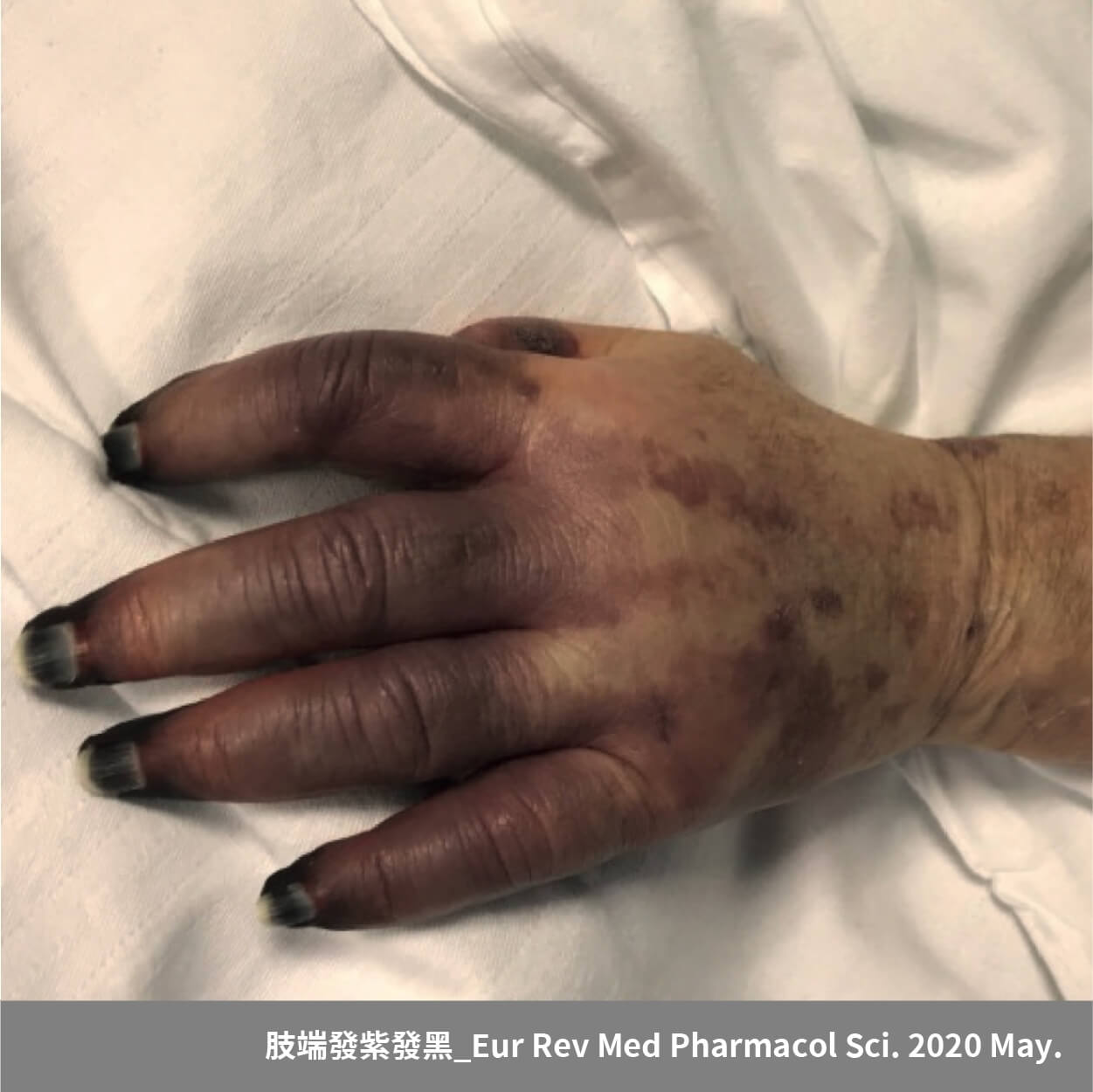 表現在皮膚上可能會出現,像是表淺靜脈網路的「網狀青斑、網狀紫斑」、「小出血點及瘀斑」或「肢端缺血、發紫發黑」等。