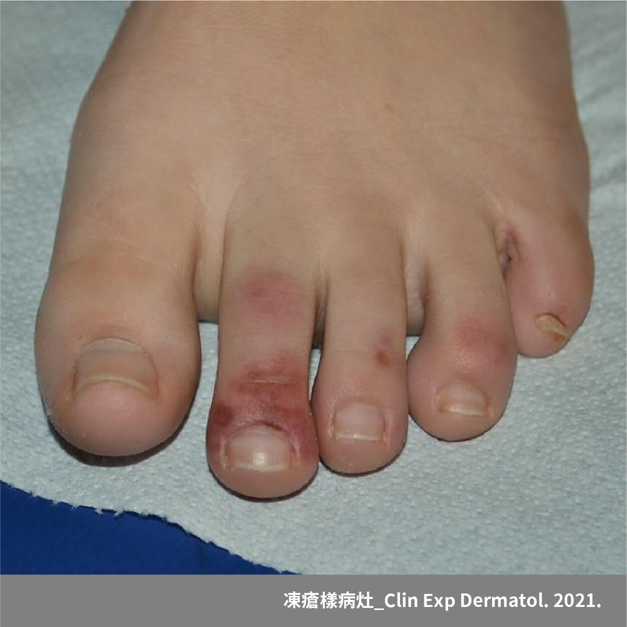 – 這種凍瘡樣病灶在白種人很常見,但在亞洲卻不常見! 因此可以說是新冠肺炎所有皮膚相關表現中,最有特色及鑑別診斷力的皮疹,因為台灣夏天幾乎不太可能出現凍瘡!如果看到,應該高度懷疑患者感染過新冠肺炎。