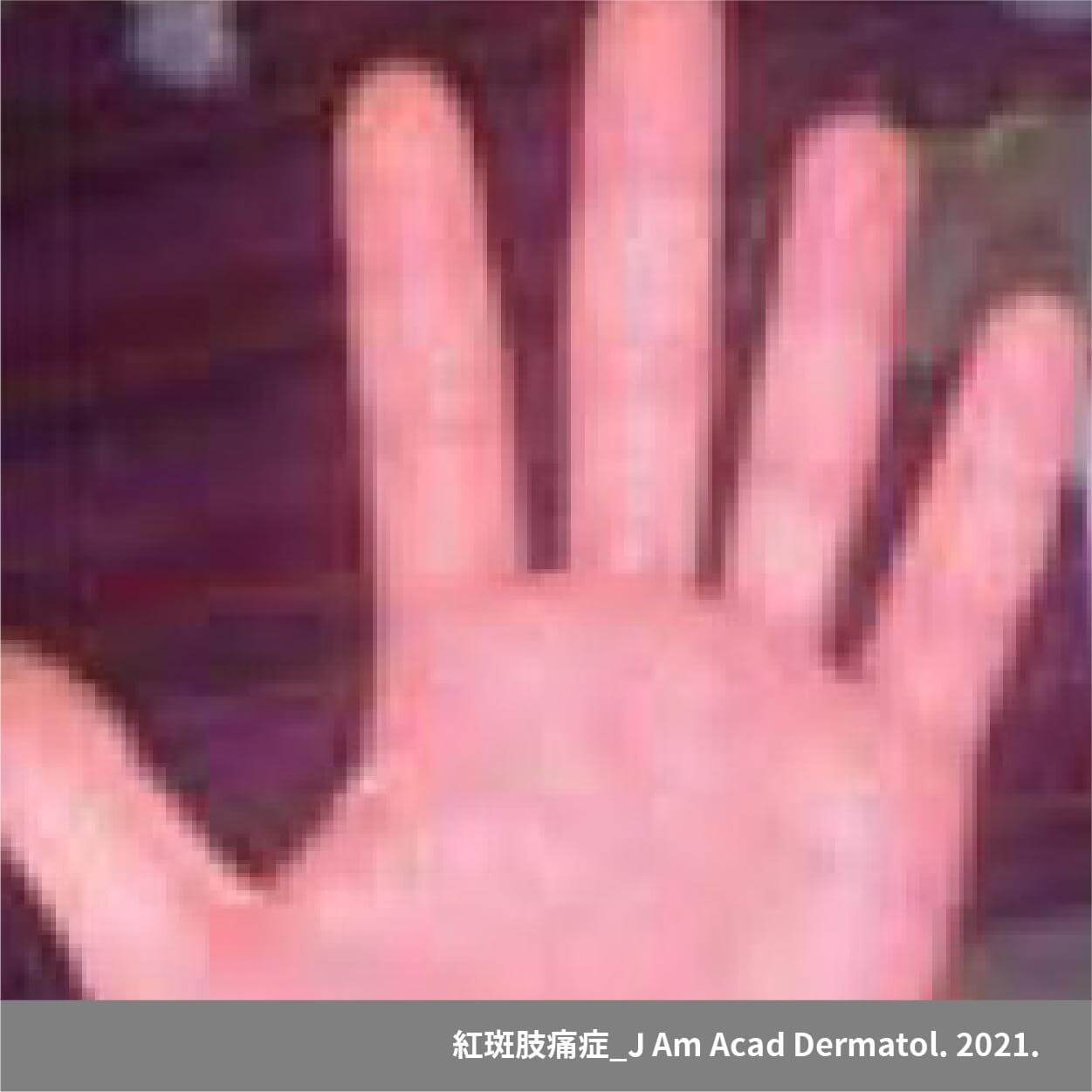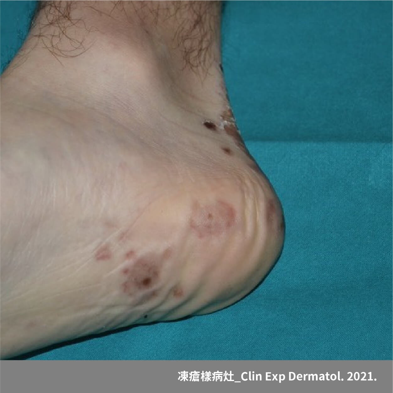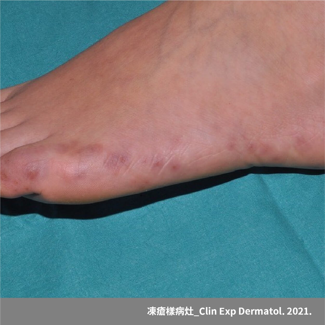 手腳等末梢出現紅腫痛癢的疹子,像被凍傷的樣子,腳比手更常見,分佈上左右不對稱,主要發生在青少年及兒童患者。
