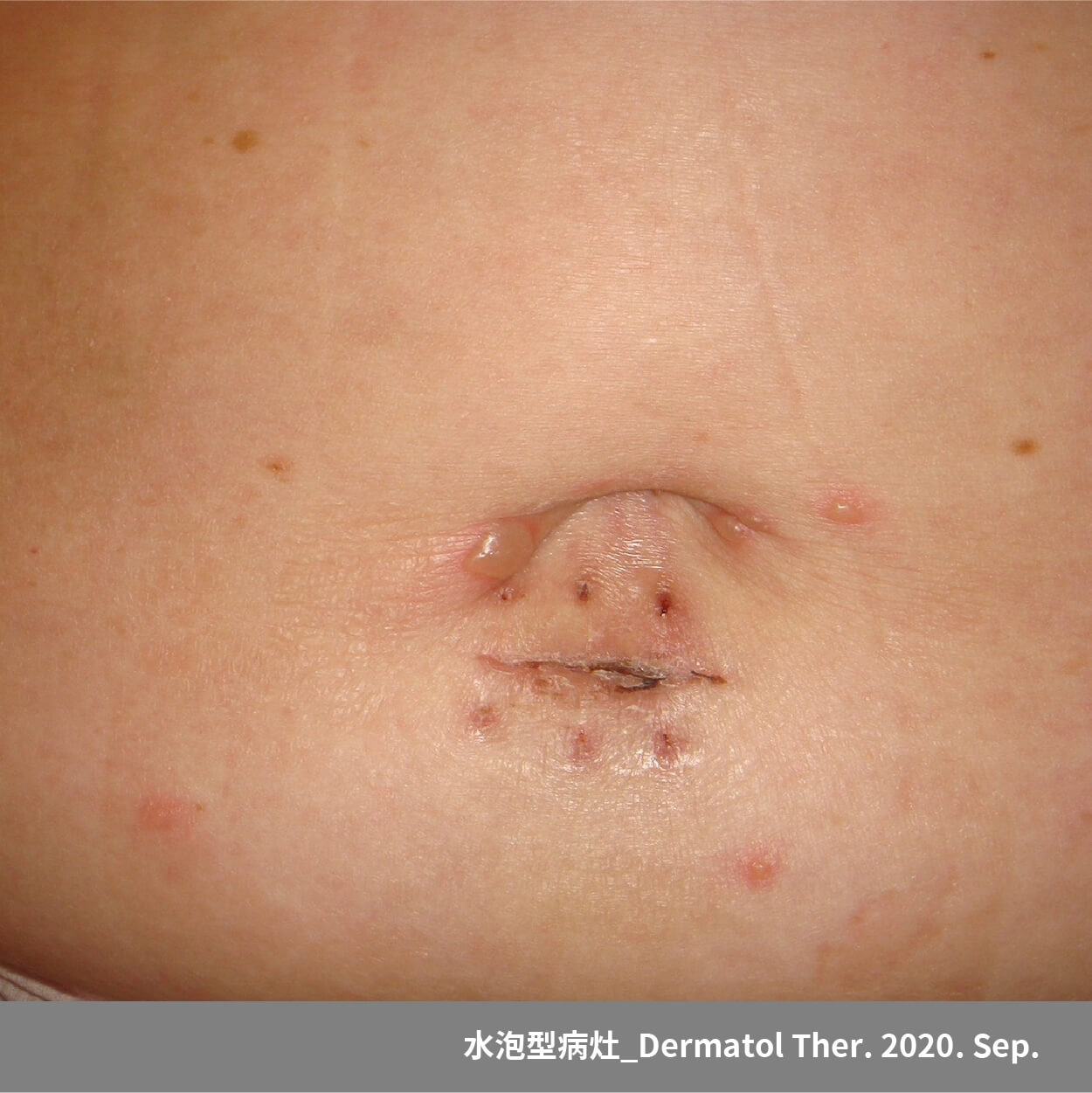 皮膚會有透明的水泡或是白色的膿皰,較常發生在中年患者,分佈可能像皰疹或水痘。