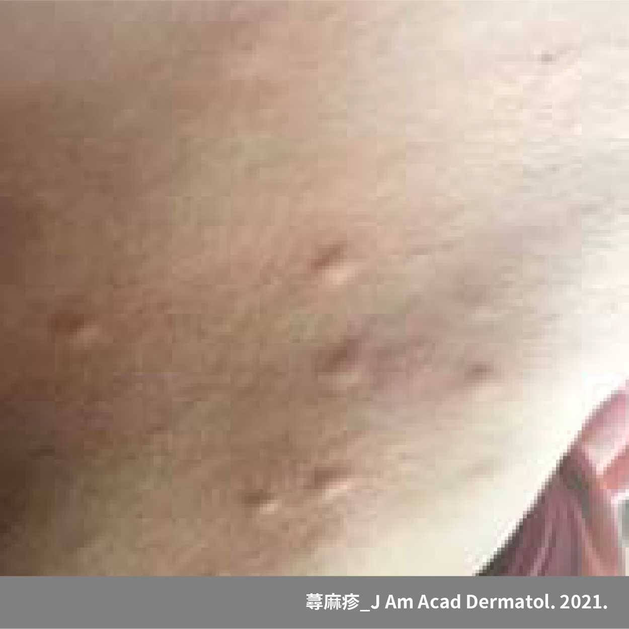 所謂蕁麻疹樣的疹子是皮膚會出現像被蚊蟲叮咬後浮起的紅色斑塊。