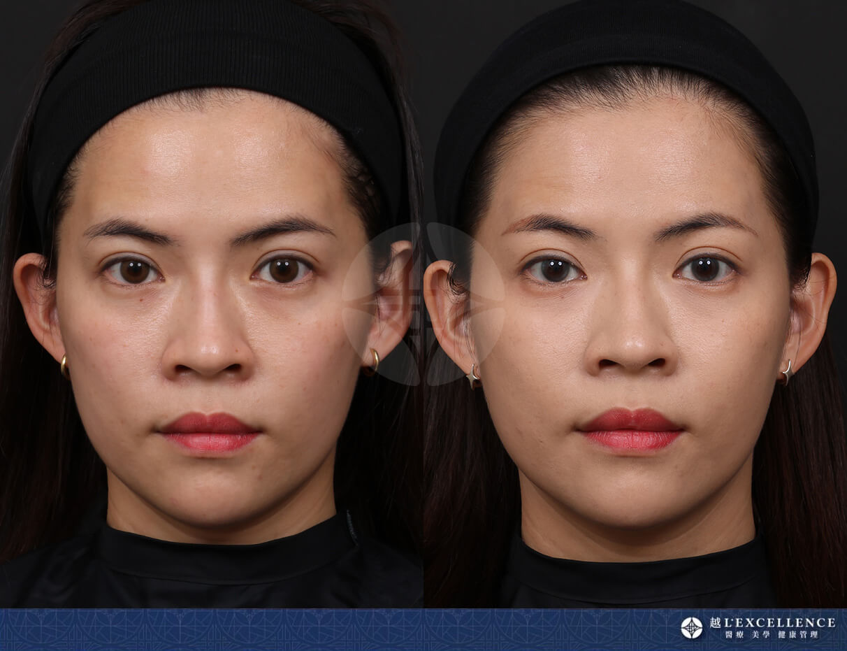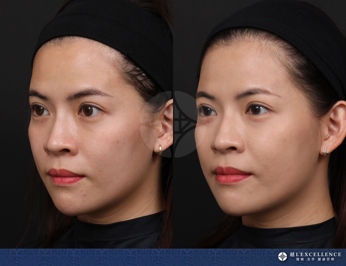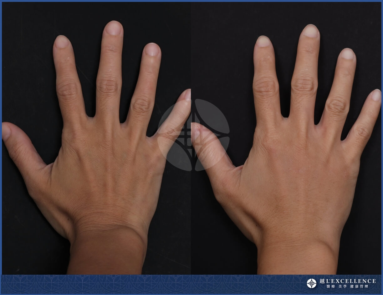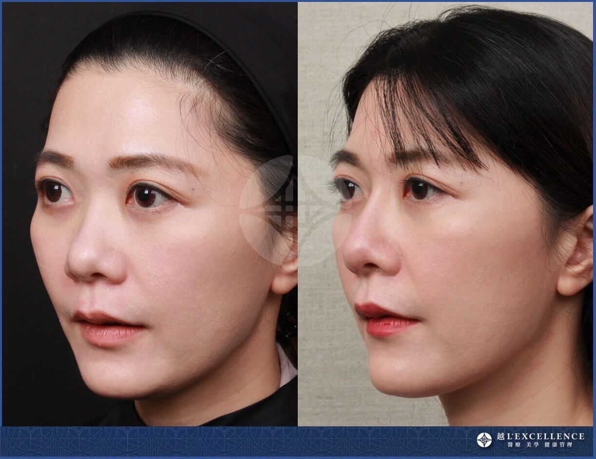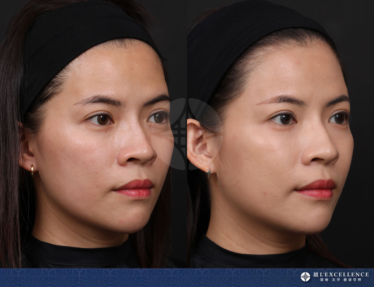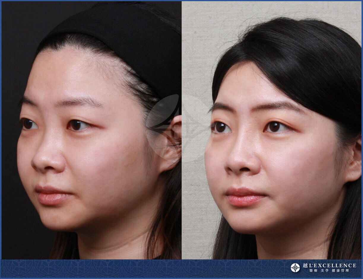 臉部精緻微雕,打造俐落輪廓-玻尿酸中文名稱:玻尿酸透明質酸。英文名稱:Hyaluronic Acid。玻尿酸是一種透明的膠狀結晶物,具有強力的吸水性,可保持肌膚彈性,可以有效增加及鎖緊肌膚中的水份,進而保持肌膚彈性與維持形狀。透過注射於治療部位,增進皮下組織的容量,讓臉部凹陷得到改善,擺脫給人的疲倦感;而立體度的運用,也能提升五官俐落感,讓鼻子、下半臉、下巴的V型線更加清楚明顯,而撫平皺紋均有不錯的效果。 治療原理玻尿酸(hyaluronic Acid,簡稱HA)學名為透明質酸,是一種外觀透明、具黏性的天然多醣類膠狀物質。玻尿酸是人體中本來就有的物質,年輕肌膚柔軟有彈性,就是因為玻尿酸以膠質型態,大量存在於人體的結締組織與真皮層中,而玻尿酸強大的保濕功能,除了可以提升肌膚的光澤與飽水度外,也是保持年輕的關鍵之一。玻尿酸進行注射後,能立即補充肌膚的儲水保濕能力,改善老化導致的組織萎縮,並讓肌膚恢復年輕豐潤感,而進階治療更可以達到臉部精雕效果,包括蘋果肌、淚溝填補、隆鼻、V下巴、豐額頭、豐頰等豐唇延伸應用。一般來說,玻尿酸注射當下就可以感受明顯效果的變化、過程中不用開刀,搭配玻尿酸不同品牌及不同分子劑型與劑量建議,以各部位量身打造的技法,才能達到全方位雕塑治療效果。 術前評估 市面上各家品牌及不同劑型的玻尿酸,注射方式以及注射深度與適合的治療部位都有所不同。越L’EXCELLENCE醫療美學主要以國際原廠三大領導品牌《Restylane瑞絲朗》、《JUVÉDERM喬雅登》及《TEOXANE緹奧希》進行玻尿酸針劑治療。透過專業醫師一對一的術前諮詢服務,醫師會根據個人臉型比例與患者對療程的期望,匯集多年臨床經驗與美感評估,提供更為精確的客製化療程,確保每位患者都能達到自然且精緻的美型輪廓。 實際案例 此案例透過醫師全臉評估,以玻尿酸針劑搭配肉毒桿菌素治療,針對全臉輪廓線條精緻提升。 此案例透過玻尿酸治療,針對易顯老態的眼窩凹陷處進行填補,免動刀即可擁有補脂手術般的術後效果。 此案例透過玻尿酸治療,拉長並修順下巴線條,改善下半臉的臉型輪廓。 此案例透過玻尿酸治療,針對凹陷的夫妻宮(太陽穴)進行填補,使臉型輪廓更加柔順。 此案例透過玻尿酸治療,針對膠原蛋白流失後的臉頰凹陷及法令紋,進行填充提升臉部膨潤度。 此案例透過玻尿酸治療,針對膠原蛋白流失後,造成的蘋果肌塌陷進行填補,找回豐潤飽滿的中臉線條感。 此案例透過玻尿酸治療,針對蘋果肌塌陷及淚溝造成的疲態感,進行不同的層次填補,找回豐潤飽滿的中臉線條感與告別淚溝造成的黑眼圈。 此案例透過大分子玻尿酸填補治療,針對下巴不對稱及過短的型態,進行不同的層次填補,找回協調且對稱的下巴線條,讓臉型輪廓更加協調。 此案例透過大分子玻尿酸填補治療,針對下巴過短的外型,進行不同的層次填補,找回協調且對稱的下巴線條,讓臉型輪廓更加協調。 此案例透過大分子玻尿酸填補治療,針對下巴過短後縮的外型,進行玻尿酸層次填補,打造屬於男生方形陽剛帥氣的下巴線條感。 此案例透過玻尿酸治療,針對淚溝填補,進而改善眼袋及黑眼圈造成的疲態感;此外,並協同音波拉提眼周2.0深度治療,另整體效果更加分。 此案例藉由玻尿酸填補方式,因避免鼻形變寬的疑慮,採獨創不同層次的注射技法,搭配產品的特色,進而改善塌陷的鼻形,呈現精緻的美感鼻形。 此案例藉由玻尿酸填補方式,因避免鼻形變寬的疑慮,採獨創不同層次的注射技法,搭配產品的特色,進而改善塌陷的鼻形,呈現精緻的美感鼻形。 此案例藉由玻尿酸填補方式,因避免鼻形變寬的疑慮,採獨創不同層次的注射技法,搭配產品的特色,進而改善塌陷的鼻形,呈現精緻的美感鼻形。 此案例藉由玻尿酸填補方式,因避免鼻形變寬的疑慮,採獨創不同層次的注射技法,搭配產品的特色,進而改善塌陷的鼻形,呈現精緻的美感鼻形。 此案例藉由玻尿酸填補方式,採特殊的注射技法,搭配產品的特色,進而改善眼窩凹陷塌的樣貌。 此案例藉由玻尿酸填補方式,採特殊的注射技法,搭配產品的特色,進而改善眼窩凹陷塌的樣貌。 手部治療 上述手部案例是透過玻尿酸針劑治療,有效改善手部皺折及細紋,此為術後六週之比對,其玻尿酸劑型及施打支數,由專業醫師評估後安排客製化療程。 上述手部案例,是藉由晶亮瓷治療。適用於手部皺褶的紋理( 雞爪手),透過產品的特性,且術後不需特別按摩,是相對自然且安全的皮下填充劑選擇。改善肌膚紋路問題,由專業醫師評估治療。 Restylane NASHA[純粹]速效水膜針 來自北歐,玻尿酸領導品牌。挺美的,追求美的旅程中,瑞絲朗一直是你的最佳靈感繆思,追求美的旅程中,瑞絲朗一直是你的最佳靈感繆思,承襲北歐設計精神,以純簡奢華的工藝打造出能抵抗變形的高彈力質純玻尿酸; 品質良好的玻尿酸劑型應有大、中、小分子之分,依照不同的治療部位及肌膚構造的需求,謹慎選擇適合的玻尿酸劑型,才能訂製專屬優雅,讓美麗持久閃耀。 NASHA [純粹]玻尿酸特色減痛配方高舒適:恢復期短立即見效溫和低敏低腫脹:99%近似天然玻尿酸效果持久看得見:12-18個月 滿意度高玻尿酸分子均勻:細緻度高 量身訂製絕佳組織支撐力:支撐拉提 雕塑輪廓 NASHA [純粹]速效水膜針。365全天候保濕增加彈性緊緻肌膚修飾細紋改善痘疤高效保濕 Restylane Vital 