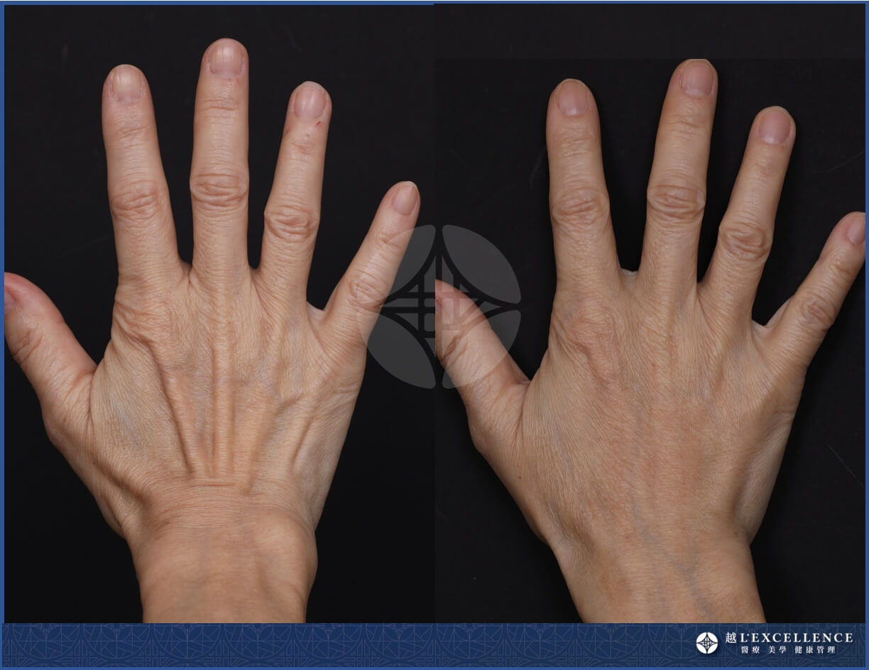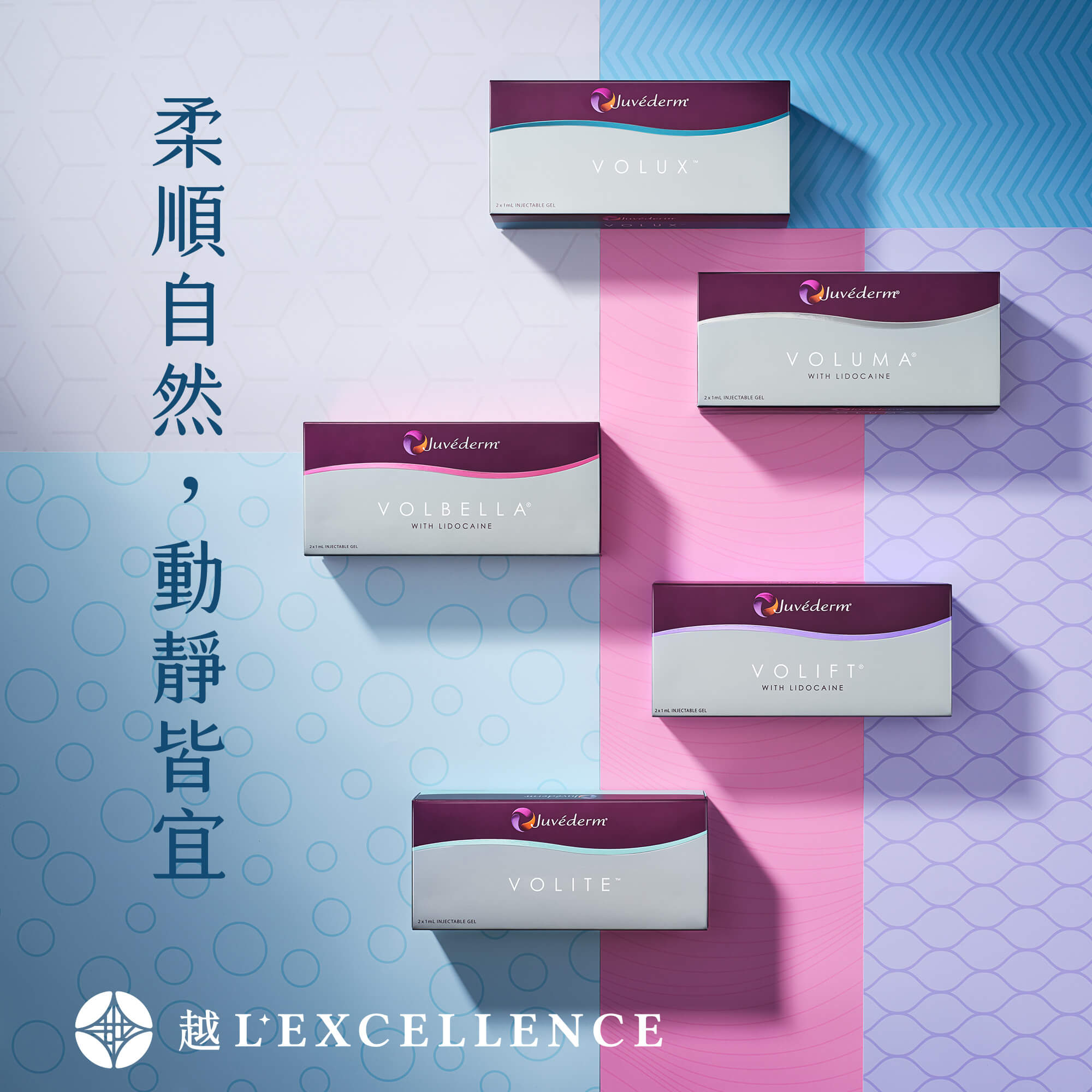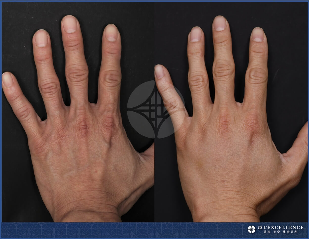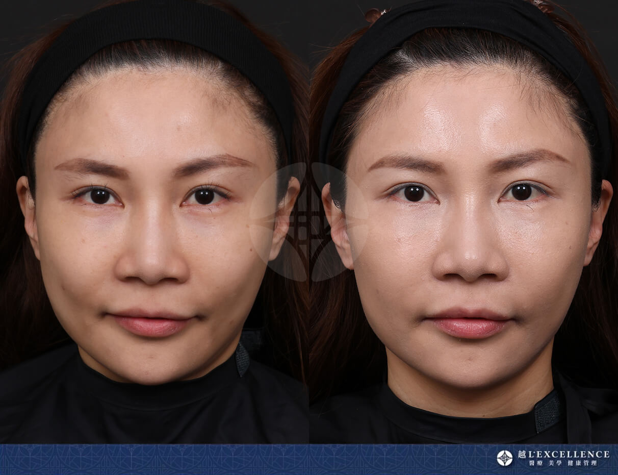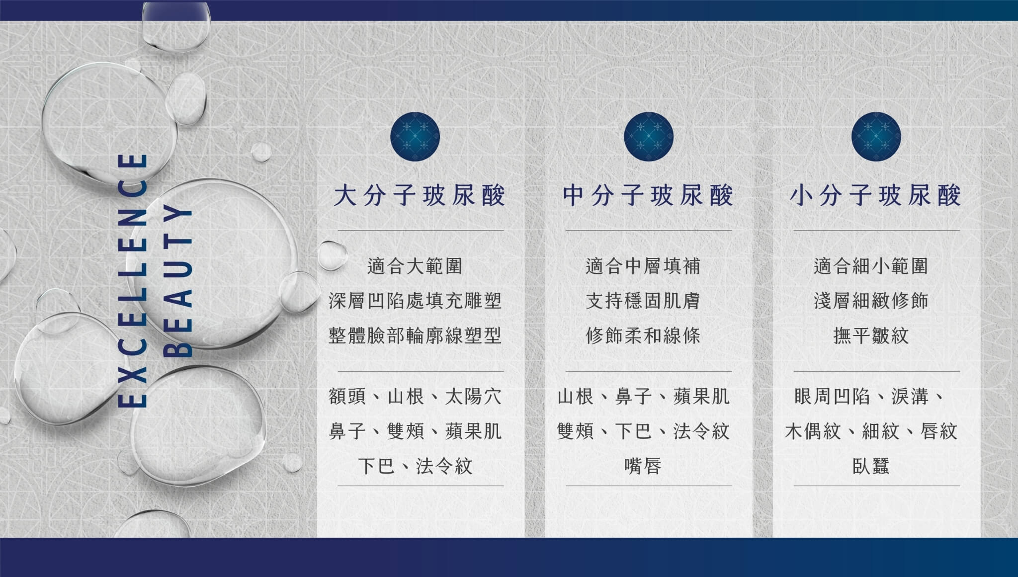 臉部精緻微雕,打造俐落輪廓-玻尿酸中文名稱:玻尿酸透明質酸。英文名稱:Hyaluronic Acid。玻尿酸是一種透明的膠狀結晶物,具有強力的吸水性,可保持肌膚彈性,可以有效增加及鎖緊肌膚中的水份,進而保持肌膚彈性與維持形狀。透過注射於治療部位,增進皮下組織的容量,讓臉部凹陷得到改善,擺脫給人的疲倦感;而立體度的運用,也能提升五官俐落感,讓鼻子、下半臉、下巴的V型線更加清楚明顯,而撫平皺紋均有不錯的效果。 治療原理玻尿酸(hyaluronic Acid,簡稱HA)學名為透明質酸,是一種外觀透明、具黏性的天然多醣類膠狀物質。玻尿酸是人體中本來就有的物質,年輕肌膚柔軟有彈性,就是因為玻尿酸以膠質型態,大量存在於人體的結締組織與真皮層中,而玻尿酸強大的保濕功能,除了可以提升肌膚的光澤與飽水度外,也是保持年輕的關鍵之一。玻尿酸進行注射後,能立即補充肌膚的儲水保濕能力,改善老化導致的組織萎縮,並讓肌膚恢復年輕豐潤感,而進階治療更可以達到臉部精雕效果,包括蘋果肌、淚溝填補、隆鼻、V下巴、豐額頭、豐頰等豐唇延伸應用。一般來說,玻尿酸注射當下就可以感受明顯效果的變化、過程中不用開刀,搭配玻尿酸不同品牌及不同分子劑型與劑量建議,以各部位量身打造的技法,才能達到全方位雕塑治療效果。 術前評估 市面上各家品牌及不同劑型的玻尿酸,注射方式以及注射深度與適合的治療部位都有所不同。越L’EXCELLENCE醫療美學主要以國際原廠三大領導品牌《Restylane瑞絲朗》、《JUVÉDERM喬雅登》及《TEOXANE緹奧希》進行玻尿酸針劑治療。透過專業醫師一對一的術前諮詢服務,醫師會根據個人臉型比例與患者對療程的期望,匯集多年臨床經驗與美感評估,提供更為精確的客製化療程,確保每位患者都能達到自然且精緻的美型輪廓。 實際案例 此案例透過醫師全臉評估,以玻尿酸針劑搭配肉毒桿菌素治療,針對全臉輪廓線條精緻提升。 此案例透過玻尿酸治療,針對易顯老態的眼窩凹陷處進行填補,免動刀即可擁有補脂手術般的術後效果。 此案例透過玻尿酸治療,拉長並修順下巴線條,改善下半臉的臉型輪廓。 此案例透過玻尿酸治療,針對凹陷的夫妻宮(太陽穴)進行填補,使臉型輪廓更加柔順。 此案例透過玻尿酸治療,針對膠原蛋白流失後的臉頰凹陷及法令紋,進行填充提升臉部膨潤度。 此案例透過玻尿酸治療,針對膠原蛋白流失後,造成的蘋果肌塌陷進行填補,找回豐潤飽滿的中臉線條感。 此案例透過玻尿酸治療,針對蘋果肌塌陷及淚溝造成的疲態感,進行不同的層次填補,找回豐潤飽滿的中臉線條感與告別淚溝造成的黑眼圈。 此案例透過大分子玻尿酸填補治療,針對下巴不對稱及過短的型態,進行不同的層次填補,找回協調且對稱的下巴線條,讓臉型輪廓更加協調。 此案例透過大分子玻尿酸填補治療,針對下巴過短的外型,進行不同的層次填補,找回協調且對稱的下巴線條,讓臉型輪廓更加協調。 此案例透過大分子玻尿酸填補治療,針對下巴過短後縮的外型,進行玻尿酸層次填補,打造屬於男生方形陽剛帥氣的下巴線條感。 此案例透過玻尿酸治療,針對淚溝填補,進而改善眼袋及黑眼圈造成的疲態感;此外,並協同音波拉提眼周2.0深度治療,另整體效果更加分。 此案例藉由玻尿酸填補方式,因避免鼻形變寬的疑慮,採獨創不同層次的注射技法,搭配產品的特色,進而改善塌陷的鼻形,呈現精緻的美感鼻形。 此案例藉由玻尿酸填補方式,因避免鼻形變寬的疑慮,採獨創不同層次的注射技法,搭配產品的特色,進而改善塌陷的鼻形,呈現精緻的美感鼻形。 此案例藉由玻尿酸填補方式,因避免鼻形變寬的疑慮,採獨創不同層次的注射技法,搭配產品的特色,進而改善塌陷的鼻形,呈現精緻的美感鼻形。 此案例藉由玻尿酸填補方式,因避免鼻形變寬的疑慮,採獨創不同層次的注射技法,搭配產品的特色,進而改善塌陷的鼻形,呈現精緻的美感鼻形。 此案例藉由玻尿酸填補方式,採特殊的注射技法,搭配產品的特色,進而改善眼窩凹陷塌的樣貌。 此案例藉由玻尿酸填補方式,採特殊的注射技法,搭配產品的特色,進而改善眼窩凹陷塌的樣貌。 手部治療 上述手部案例是透過玻尿酸針劑治療,有效改善手部皺折及細紋,此為術後六週之比對,其玻尿酸劑型及施打支數,由專業醫師評估後安排客製化療程。 上述手部案例,是藉由晶亮瓷治療。適用於手部皺褶的紋理( 雞爪手),透過產品的特性,且術後不需特別按摩,是相對自然且安全的皮下填充劑選擇。改善肌膚紋路問題,由專業醫師評估治療。 Restylane NASHA[純粹]速效水膜針 來自北歐,玻尿酸領導品牌。挺美的,追求美的旅程中,瑞絲朗一直是你的最佳靈感繆思,追求美的旅程中,瑞絲朗一直是你的最佳靈感繆思,承襲北歐設計精神,以純簡奢華的工藝打造出能抵抗變形的高彈力質純玻尿酸; 品質良好的玻尿酸劑型應有大、中、小分子之分,依照不同的治療部位及肌膚構造的需求,謹慎選擇適合的玻尿酸劑型,才能訂製專屬優雅,讓美麗持久閃耀。 NASHA [純粹]玻尿酸特色減痛配方高舒適:恢復期短立即見效溫和低敏低腫脹:99%近似天然玻尿酸效果持久看得見:12-18個月 滿意度高玻尿酸分子均勻:細緻度高 量身訂製絕佳組織支撐力:支撐拉提 雕塑輪廓 NASHA [純粹]速效水膜針。365全天候保濕增加彈性緊緻肌膚修飾細紋改善痘疤高效保濕 Restylane Vital 