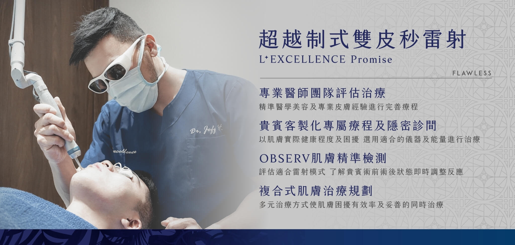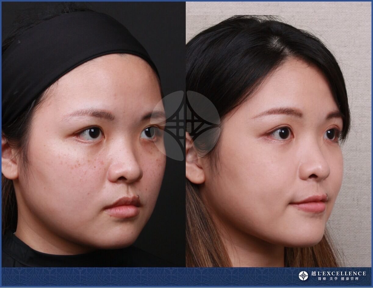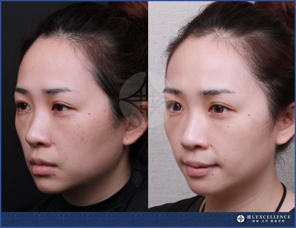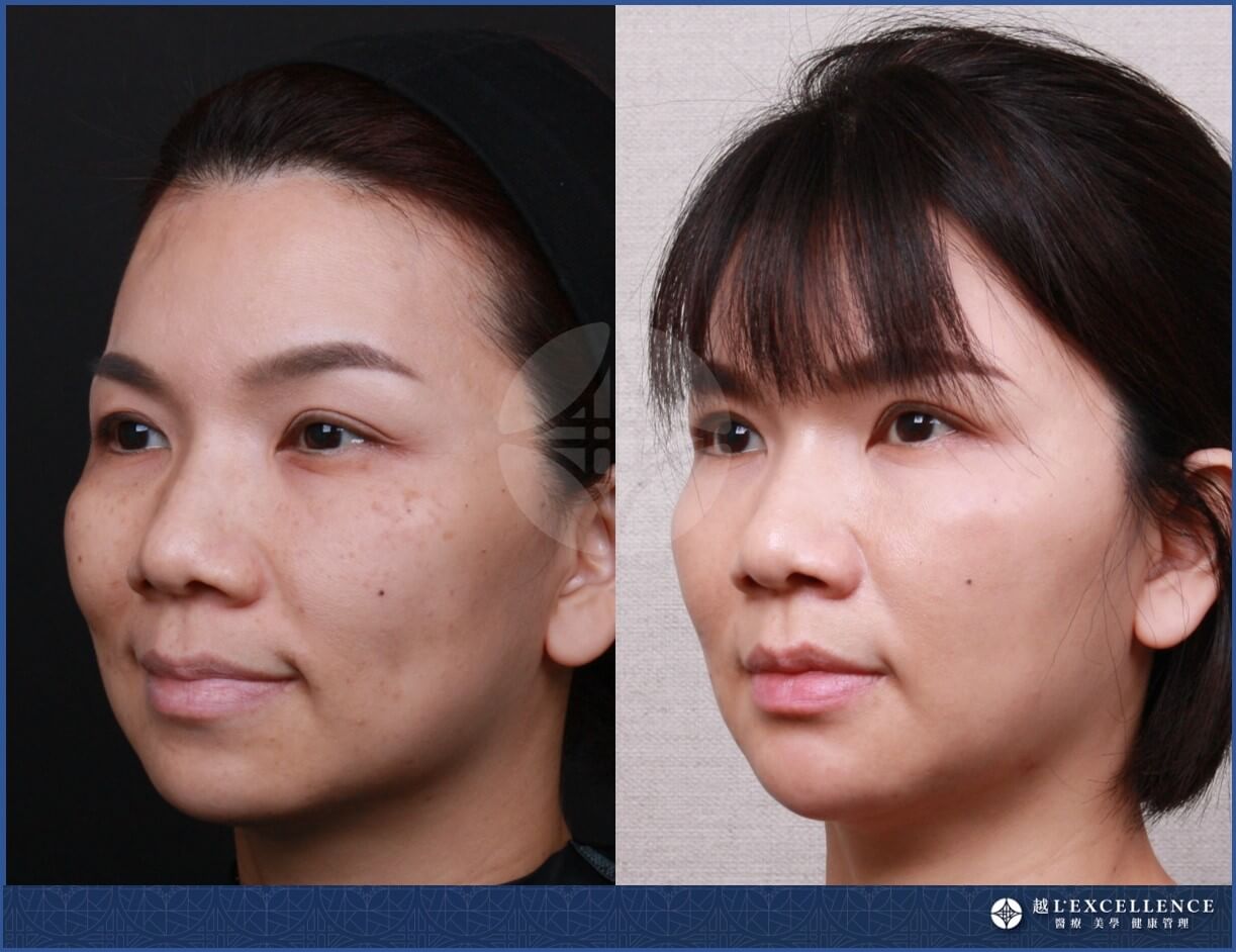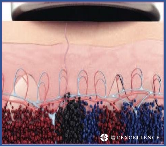 超越制式雙皮秒雷射,PicoSure Pro鉑金蜂巢 & PicoWay全像聚焦越L’EXCELLENCE醫療團隊,採用美國原廠皮秒雷射PicoSure Pro及PicoWay儀器,均通過美國FDA及台灣衛福部認證,涵蓋了完整的532nm / 755nm / 1064nm 全波段,而PicoWay全像聚焦科技與PicoSure Pro鉑金蜂巢透鏡,都是將高速、高能量的雷射作用於肌膚中形成聚焦點,無論是膚質各種暗沈、斑點、痘疤與粗大毛孔困擾,均能刺激膠原蛋白增生,撫平痘疤、細紋、毛孔等斑點色素問題,進而讓肌膚更為細緻透亮。 院內實際案例 院內刺青案例 原廠儀器介紹 PicoSure Pro 鉑金蜂巢皮秒雷射中文名稱: 色若修皮秒亞歷山大雷射及配件英文名稱:Cynosure PicoSure Alexandrite Laser and Accessories衛署醫器輸字第028802號PicoSure PRO 鉑金蜂巢皮秒雷射|10年技術巔峰,再次突破極限來自美國原廠的PicoSure PRO皮秒雷射,承襲十年頂尖技術,再升級!搭載全球最新專利技術「Platinum Focus™ 鉑金蜂巢透鏡」,啟動Turbo Mode,大幅縮短雷射輸出時間,熱傷害更少、療效更精準。獨家755nm波長,能在極短的**550皮秒(550×10⁻¹²秒)**內,將黑色素擊碎成微米粉塵,層層喚醒肌膚淨白潛能。 PicoWay全像超皮秒雷射中文名稱:肯得拉皮秒衛釹雅克雷射系統英文名稱:Candela PicoWay Laser System衛署醫器輸字第027962號深度與治療廣泛程度都俱增超短脈衝,時間是皮秒雷射的獨特優勢,時間越短,熱能越少,能量卻增強。治療時透過短脈衝將瞬間能量增強,能達成治療需要的光震波效應,不但能夠有效率的破壞皮膚的色素與斑點,卻又不會過度產生熱能,治療恢復期相當短,有別於傳統雷射副作用。 作用原理PicoSure Pro鉑金皮秒雷射以單波長755nm;PicoWay超皮秒雷射,則是雙波長1064nm及532nm不同波長。PicoSure Pro 755 鉑金皮秒雷射波長專攻黑色素, 使其對於除斑更具效果。755nm波長對黑色素的吸收率是1064nm波長的3倍, 其高精確度確保術後的皮膚幾乎沒有皮下出血或是開放性出血, 縮短了恢復期。755nm 是適合亞洲人膚色的波長, 反黑風險小︑ 除斑效率高。搭載全球專利「鉑金蜂巢瞬效透鏡(Platinum Focus™)」,全新的聚焦鏡面設計及鍍膜技術,使得能量輸出更穩定,可以將雷射光束重新分割聚焦,提升雷射能量,還能在不傷害皮膚、沒有傷口的情況下,產生「空泡效應(LIOB,laser-induced optical breakdown)」,啟動肌膚修復機制,刺激膠原蛋白重組,優雅揮別改善毛孔粗大、痘疤以及細紋等困擾。PicoWay超皮秒雷射,全像聚焦科技結合「全像擴散」及「雙層聚焦」的特性,以繞射方式將光束先分流再聚焦,並將22倍高強度的治療瞬間打入肌膚底層,在不傷害表皮的情況下,形成光學空泡效應(LIOB),如同在肌膚底層打入雙層的隱形飛梭,卻沒有飛梭療程的熱痛感與恢復期。1064奈米波長可深入聚焦於真皮層,532奈米波長則可聚焦在表皮層,上下的雙層作用,透過高速皮秒震波的360度全像擴散。有效使膠原蛋白與彈力纖維活化,就像在肌膚裡起了3D立體的填充作用,讓肌膚修護全面啟動,使肌膚更健康、飽滿、緊實。 治療前,肌膚底層色素如同圖示上方色彩粒子。 奈秒治療,光熱與部分光震效應作用,將色彩粒子擊碎成小粒子。 皮秒治療,高速光震波效應作用,擊碎至極小的粒子,再透過身體代謝。 什麼是 Picosecond (皮秒)?皮秒為一時間單位,在皮秒出現以前,一般雷射機台的治療時間以奈秒為主(10⁻⁹秒),經過科學的進步,研發出比奈秒快1000倍的皮秒(10⁻¹²秒)時間,而 Picosure Pro 755 皮秒雷射的 550 picoseconds (ps) 能讓每一道雷射光在 550×10⁻¹² 秒的時間內,就將雷射能量完全釋放,將黑色素在短時間內震碎為粉塵,不僅降低熱傷害、縮短恢復期,且能降低反黑機率,並能讓黑色素在極短的時間內快速代謝出體外。 尚未治療的黑色素斑塊。 傳統雷射治療後,黑色素呈顆粒狀態。 755 皮秒雷射治療後,黑色素呈現粉狀。 經由不同雷射對黑色素的比較圖,能夠看出在經過 Picosure Pro 755 皮秒雷射治療後,黑色素變得更細小,經皮秒脈衝震碎後的粉塵狀態,也更容易被體內的免疫細胞吞噬,能夠大幅減輕發炎反應的發生,甚至是大多數人擔心的發紅、反黑等雷射副作用。 一般雷射治療後比較。 超皮秒雷射治療後比較。 脈衝時間愈短,光震波效應愈多 安全性 色斑破壞性強。可針對小粒子色素去除。針對彩色刺青效果好。 有效性 熱傷害少。治療能量低。治療舒適度高。少副作用。恢復期短。 深度與治療廣泛程度都俱增超短脈衝,時間是皮秒雷射的獨特優勢,時間越短,熱能越少,能量卻增強。治療時透過短脈衝將瞬間能量增強,能達成治療需要的「光震波效應」,不但能夠有效率的破壞皮膚的色素與斑點,卻又不會過度產生熱能,治療恢復期相當短,有別於傳統雷射副作用。 波長選擇標準模式:淨膚、除斑、除刺青。全像聚焦模式:隱形飛梭、除皺、痘疤、改善膚質 以雙皮秒科技治療黑色素、刺青問題的光療儀器在台灣已有多種,其中PicoSure皮秒雷射因最早引進台灣並取得美國FDA認證,因此又俗稱皮秒儀器的「機皇」,在治療經驗與口碑深獲專業醫師及客人的推薦。越L’EXCELLENCE醫療團隊,由皮膚專科醫師評估,並針對不同深、淺黑色素種類,超越制式化療程改善肌膚各項困擾,期望可以給予客人全方位的皮秒雷射服務。 適應症 靚白除斑 各式表淺、深層斑點。咖啡牛奶斑、曬斑、雀斑、老人斑、肝斑等。色素型斑點(曬斑、雀斑、色素沉澱)肝斑青春痘疤痕紋路細