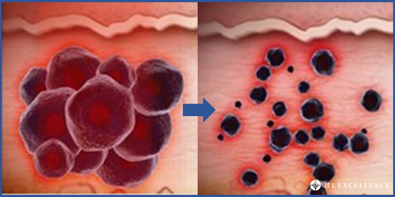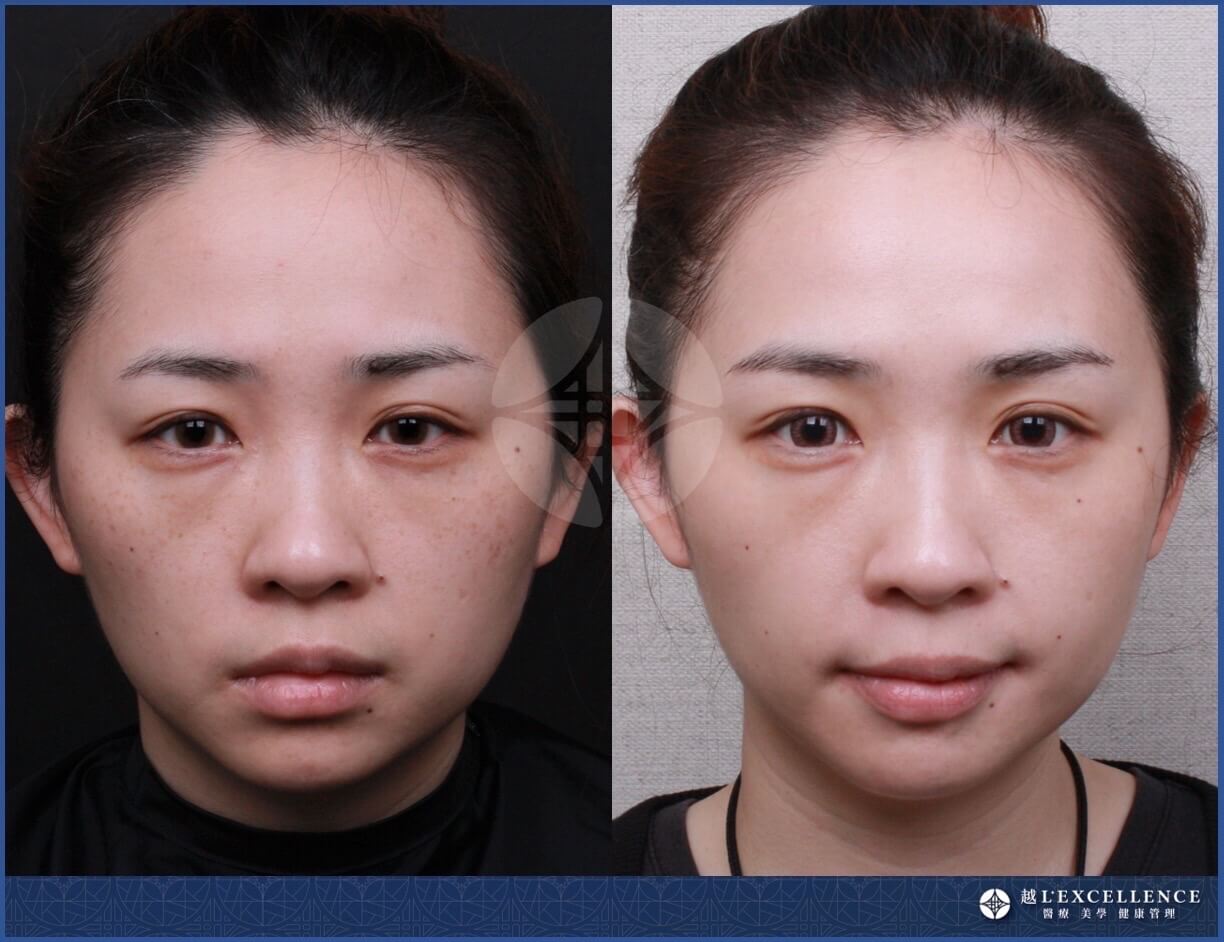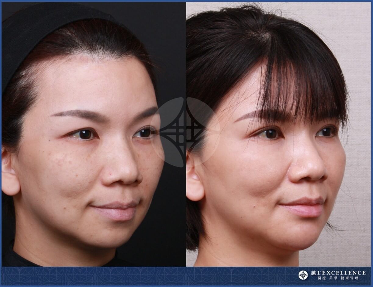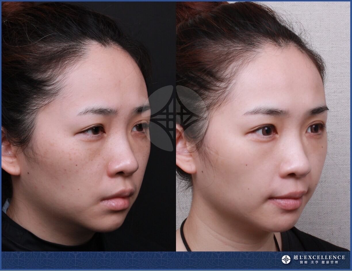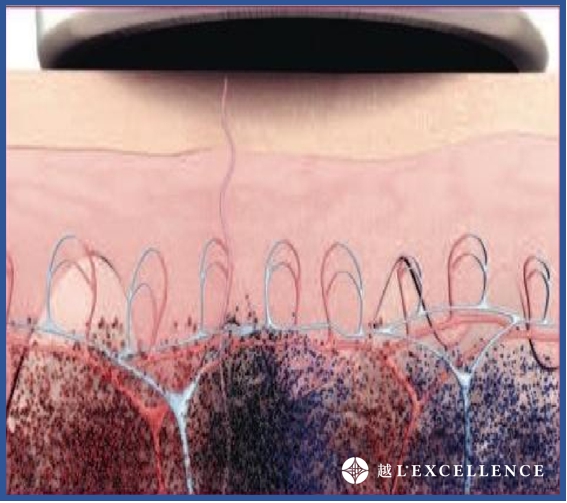 超越制式雙皮秒雷射,PicoSure Pro鉑金蜂巢 & PicoWay全像聚焦越L’EXCELLENCE醫療團隊,採用美國原廠皮秒雷射PicoSure Pro及PicoWay儀器,均通過美國FDA及台灣衛福部認證,涵蓋了完整的532nm / 755nm / 1064nm 全波段,而PicoWay全像聚焦科技與PicoSure Pro鉑金蜂巢透鏡,都是將高速、高能量的雷射作用於肌膚中形成聚焦點,無論是膚質各種暗沈、斑點、痘疤與粗大毛孔困擾,均能刺激膠原蛋白增生,撫平痘疤、細紋、毛孔等斑點色素問題,進而讓肌膚更為細緻透亮。 院內實際案例 院內刺青案例 原廠儀器介紹 PicoSure Pro 鉑金蜂巢皮秒雷射中文名稱: 色若修皮秒亞歷山大雷射及配件英文名稱:Cynosure PicoSure Alexandrite Laser and Accessories衛署醫器輸字第028802號PicoSure PRO 鉑金蜂巢皮秒雷射|10年技術巔峰,再次突破極限來自美國原廠的PicoSure PRO皮秒雷射,承襲十年頂尖技術,再升級!搭載全球最新專利技術「Platinum Focus™ 鉑金蜂巢透鏡」,啟動Turbo Mode,大幅縮短雷射輸出時間,熱傷害更少、療效更精準。獨家755nm波長,能在極短的**550皮秒(550×10⁻¹²秒)**內,將黑色素擊碎成微米粉塵,層層喚醒肌膚淨白潛能。 PicoWay全像超皮秒雷射中文名稱:肯得拉皮秒衛釹雅克雷射系統英文名稱:Candela PicoWay Laser System衛署醫器輸字第027962號深度與治療廣泛程度都俱增超短脈衝,時間是皮秒雷射的獨特優勢,時間越短,熱能越少,能量卻增強。治療時透過短脈衝將瞬間能量增強,能達成治療需要的光震波效應,不但能夠有效率的破壞皮膚的色素與斑點,卻又不會過度產生熱能,治療恢復期相當短,有別於傳統雷射副作用。 作用原理PicoSure Pro鉑金皮秒雷射以單波長755nm;PicoWay超皮秒雷射,則是雙波長1064nm及532nm不同波長。PicoSure Pro 755 鉑金皮秒雷射波長專攻黑色素, 使其對於除斑更具效果。755nm波長對黑色素的吸收率是1064nm波長的3倍, 其高精確度確保術後的皮膚幾乎沒有皮下出血或是開放性出血, 縮短了恢復期。755nm 是適合亞洲人膚色的波長, 反黑風險小︑ 除斑效率高。搭載全球專利「鉑金蜂巢瞬效透鏡(Platinum Focus™)」,全新的聚焦鏡面設計及鍍膜技術,使得能量輸出更穩定,可以將雷射光束重新分割聚焦,提升雷射能量,還能在不傷害皮膚、沒有傷口的情況下,產生「空泡效應(LIOB,laser-induced optical breakdown)」,啟動肌膚修復機制,刺激膠原蛋白重組,優雅揮別改善毛孔粗大、痘疤以及細紋等困擾。PicoWay超皮秒雷射,全像聚焦科技結合「全像擴散」及「雙層聚焦」的特性,以繞射方式將光束先分流再聚焦,並將22倍高強度的治療瞬間打入肌膚底層,在不傷害表皮的情況下,形成光學空泡效應(LIOB),如同在肌膚底層打入雙層的隱形飛梭,卻沒有飛梭療程的熱痛感與恢復期。1064奈米波長可深入聚焦於真皮層,532奈米波長則可聚焦在表皮層,上下的雙層作用,透過高速皮秒震波的360度全像擴散。有效使膠原蛋白與彈力纖維活化,就像在肌膚裡起了3D立體的填充作用,讓肌膚修護全面啟動,使肌膚更健康、飽滿、緊實。 治療前,肌膚底層色素如同圖示上方色彩粒子。 奈秒治療,光熱與部分光震效應作用,將色彩粒子擊碎成小粒子。 皮秒治療,高速光震波效應作用,擊碎至極小的粒子,再透過身體代謝。 什麼是 Picosecond (皮秒)?皮秒為一時間單位,在皮秒出現以前,一般雷射機台的治療時間以奈秒為主(10⁻⁹秒),經過科學的進步,研發出比奈秒快1000倍的皮秒(10⁻¹²秒)時間,而 Picosure Pro 755 皮秒雷射的 550 picoseconds (ps) 能讓每一道雷射光在 550×10⁻¹² 秒的時間內,就將雷射能量完全釋放,將黑色素在短時間內震碎為粉塵,不僅降低熱傷害、縮短恢復期,且能降低反黑機率,並能讓黑色素在極短的時間內快速代謝出體外。 尚未治療的黑色素斑塊。 傳統雷射治療後,黑色素呈顆粒狀態。 755 皮秒雷射治療後,黑色素呈現粉狀。 經由不同雷射對黑色素的比較圖,能夠看出在經過 Picosure Pro 755 皮秒雷射治療後,黑色素變得更細小,經皮秒脈衝震碎後的粉塵狀態,也更容易被體內的免疫細胞吞噬,能夠大幅減輕發炎反應的發生,甚至是大多數人擔心的發紅、反黑等雷射副作用。 一般雷射治療後比較。 超皮秒雷射治療後比較。 脈衝時間愈短,光震波效應愈多 安全性 色斑破壞性強。可針對小粒子色素去除。針對彩色刺青效果好。 有效性 熱傷害少。治療能量低。治療舒適度高。少副作用。恢復期短。 深度與治療廣泛程度都俱增超短脈衝,時間是皮秒雷射的獨特優勢,時間越短,熱能越少,能量卻增強。治療時透過短脈衝將瞬間能量增強,能達成治療需要的「光震波效應」,不但能夠有效率的破壞皮膚的色素與斑點,卻又不會過度產生熱能,治療恢復期相當短,有別於傳統雷射副作用。 波長選擇標準模式:淨膚、除斑、除刺青。全像聚焦模式:隱形飛梭、除皺、痘疤、改善膚質 以雙皮秒科技治療黑色素、刺青問題的光療儀器在台灣已有多種,其中PicoSure皮秒雷射因最早引進台灣並取得美國FDA認證,因此又俗稱皮秒儀器的「機皇」,在治療經驗與口碑深獲專業醫師及客人的推薦。越L’EXCELLENCE醫療團隊,由皮膚專科醫師評估,並針對不同深、淺黑色素種類,超越制式化療程改善肌膚各項困擾,期望可以給予客人全方位的皮秒雷射服務。 適應症 靚白除斑 各式表淺、深層斑點。咖啡牛奶斑、曬斑、雀斑、老人斑、肝斑等。色素型斑點(曬斑、雀斑、色素沉澱)肝斑青春痘疤痕紋路細