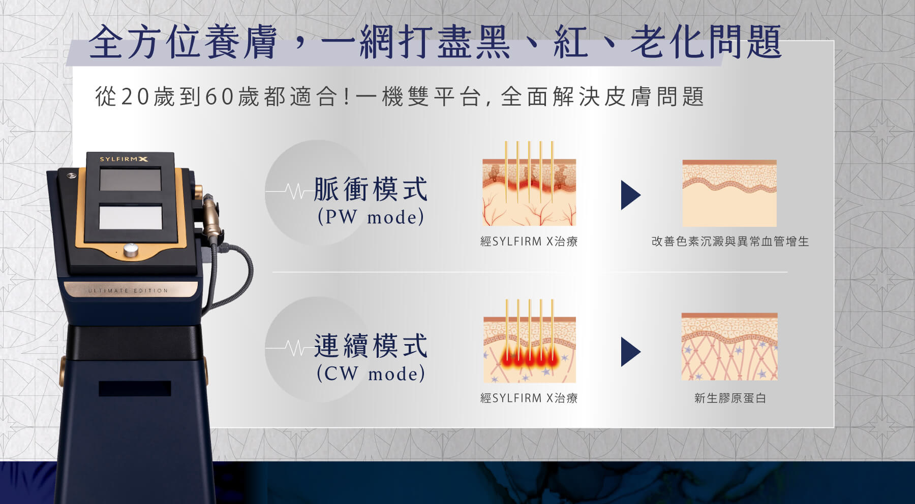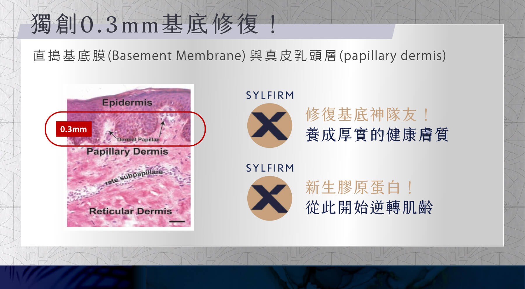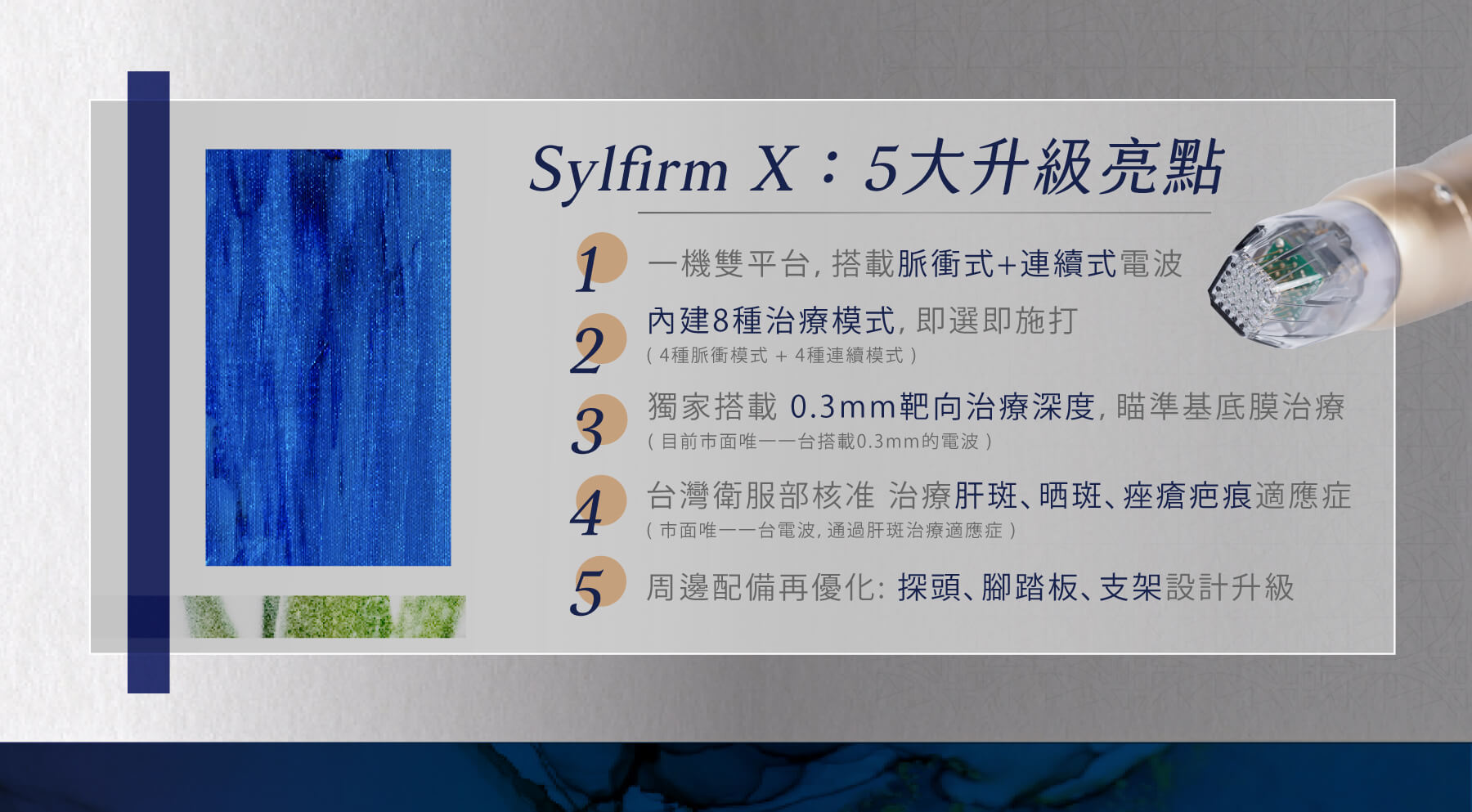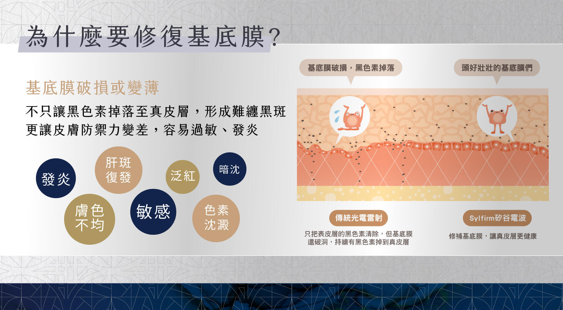若將肝斑比喻成劣質商品,只擊碎表面黑色素細胞,如同沒有從源頭控管品質,劣質商品能持續被製造,因此Sylfirm X 矽谷電波就如同在源頭控管,重建肌膚厚度、養好肌膚防禦力,再搭配其他的光療儀器進行改善,才能達到期望值的改善成效。