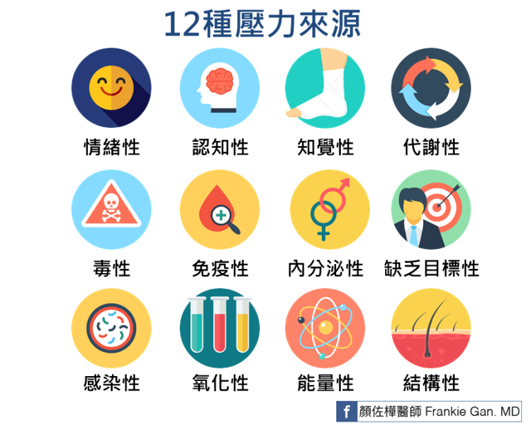 經由詳細問診、適當檢測,應該都能合適辨識並評量以上的壓力源。這個清單提醒我們,壓力來自很多面向。因此健康總是要從多個面向、整體性的去考量,才能真正做到疾病預防,達到最佳的狀態。