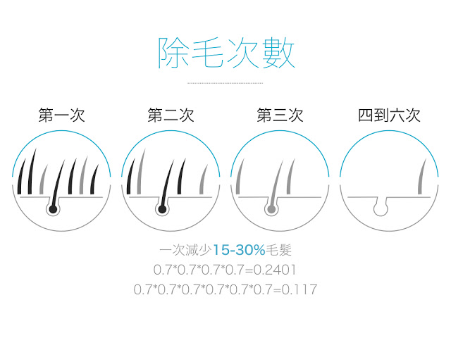 因為每次除毛針對生長期的毛髮效果較好,而休止期以及衰退期的毛髮則效果較差,所以平均一次除毛雷射可以除的毛髮為15-30%左右,因此平均除四次剩下24%左右毛髮量,除六次剩下11%毛髮量。