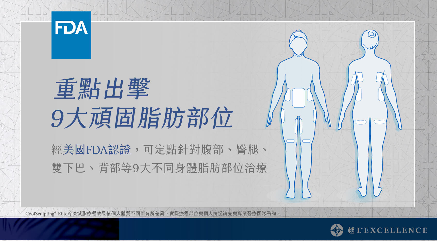CoolSculpting Elite 獲FDA認證,可定點針對9大脂肪積聚的顯眼部位︰雙下巴、大腿內外側、腹部、腰側、副乳、上背、臀底線及上臂;同時亦認證可用於治療影響雙下巴外觀的鬆弛組織。