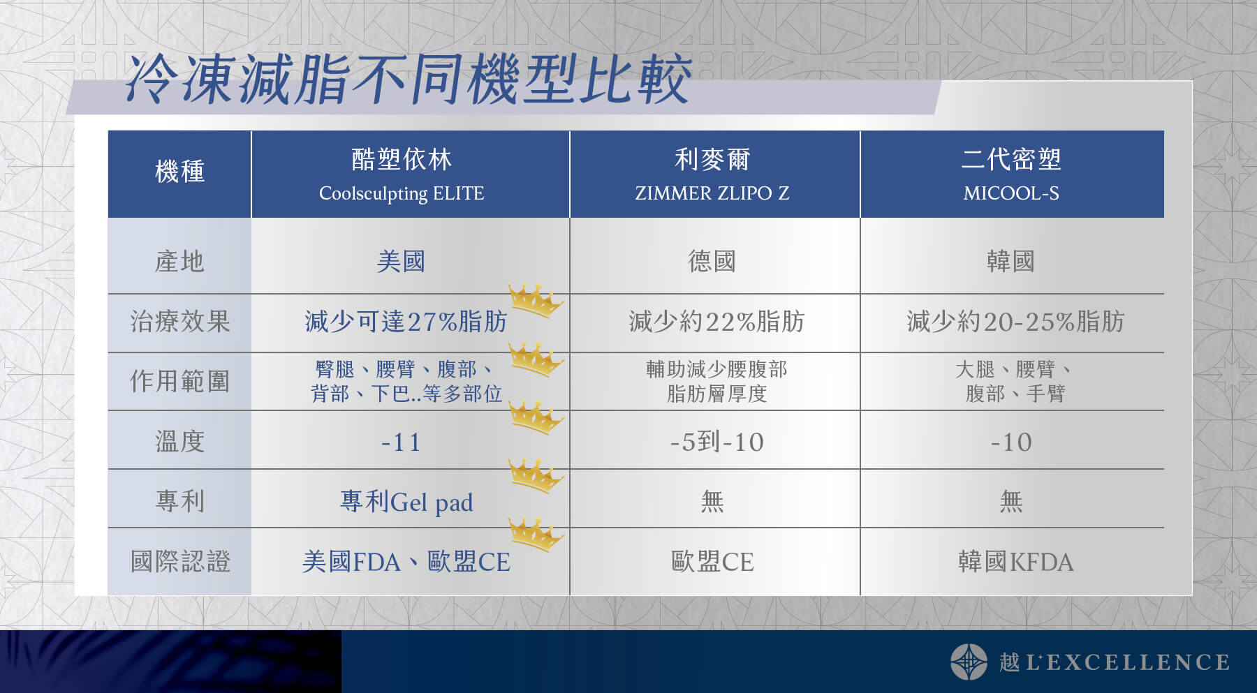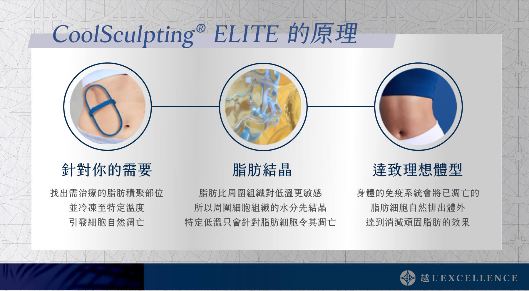 全面升級的CoolSculpting Elite 透過冷凍溶脂技術,針對9大身體部位的脂肪,以非侵入方式擊退高達 27%脂肪,CoolSculpting Elite 可重點出擊 ,消除局部脂肪。療程經美國FDA 認證,可定點針對雙下巴以至背部脂肪等 9大不同身體部位執行療程。藉由〔越L’excellence醫療美學〕專業醫療團隊規劃,打造適合你需要和塑身目標的療程。