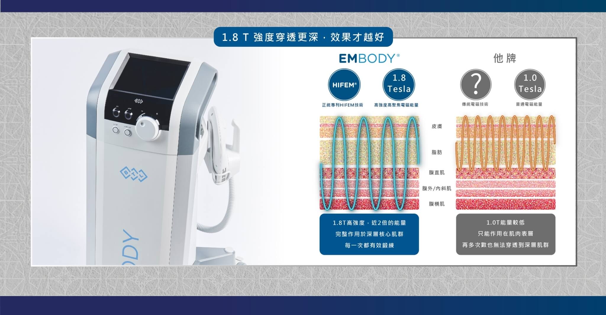 EMBODY是由英國BTL研發製作,並且使用專利HIFEM(High-Intensity Focused Electromagnetic)高強度聚焦磁能技術的核心體雕儀器,可以使肌肉完成在自主運動下無法達到的「超極限收縮」,讓肌肉產生高強度的擴張及收縮,同時深度最深達可達7公分,激活深層的肌群進行運動。