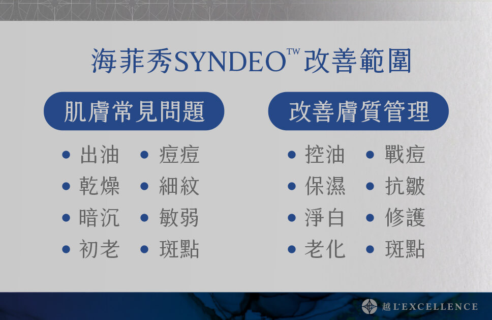 卓越的皮膚健康管理系統-海菲秀SYNDEO™中文名稱:愛奇海菲秀系統 (未滅菌)。英文名稱:Edge HydraFacial SYNDEO™ Systems (Non-Sterile)。衛部醫器輸壹字第019502號。HydraFacial海菲秀為非侵入且非雷射光療類的肌膚保養療程,採用四合一水渦流技術(4-in-1 Vortex technology),可溫和無痛地清除臉上堆積的髒污與老廢角質,讓肌膚在保濕力充足的情況下,改善膚質上的微小瑕疵與多樣性肌膚問題,維持透亮、健康的良好肌膚狀況。 作用原理美國專利的HydraFacial 愛奇海菲秀系統,採用四合一水渦流技術(4-in-1 Vortex technology),具備專利探頭、專利水渦流技術、美容精華導入三大要素,在操作時,會利用螺旋探頭搭配水渦流技術注入,並將美容精華液帶入肌膚,達到保濕、抑制痘痘生長、清潔毛孔、排出粉刺等效果。越L’EXCELLENCE診所醫師團隊,會根據每一位來診的膚質實際狀況,以客製化肌膚健康管理方式,適度調整導入精華項目,給予肌膚健康的活力光采。 四合一雙向引流渦流技術 專利渦流潔膚 潔淨螺旋頭能深入清潔毛孔,軟化及去除角質,有助提升皮膚水潤成效。 專利渦流煥膚 獲得專利的HydroPeel®具多重磨研邊,每一次移動能達到多次去除老化角質的效果,加速皮膚代謝,重現光采。 專利渦流淨化 漩渦式抽走黑頭、白頭粉刺和過多皮膚油脂,過程快速無痛。 專利渦流修護導入 獨特的雙向引流設計,為皮膚注入養分和水分,改善油性皮膚、色斑、細紋和皺紋的問題。 院內美背案例 此案例透過活氧泡泡電波(OxyGeneo)特殊設計之振動探頭,採三合一療程導入產品的同時去除角質層,並交替海菲秀SYNDEO™ 療程,讓背部的老廢角質及痘痘逐漸改善。 3步驟經典療程,改善多項肌膚困擾 去角質+清潔乳酸軟化皮脂+海藻萃取滋潤保濕+溫和清除肌膚老廢角質 吸取髒污+保濕水楊酸加強清除油脂+蜂蜜萃取保濕抗菌+針對油性部位清除毛孔髒污 渦漩注入+防護小分子玻尿酸鎖水保濕+抗氧化劑中和環境自由基傷害+增強肌膚抗氧化力 污水療程後清出之老化角質及毛孔深層髒污 海菲秀 SYNDEO™ 保養過程雖然患者不會感受到刺激或者敏感,但是肌膚的敏弱度因人而異,有時皮膚乾癢的患者再進行前還是要先經醫師評估,一般完整的美容課程包含以下階段。 STEP 1 → Cleansing Solution 深層清潔,溫和不緊繃 溫和的配方可有效清潔皮膚髒污及多餘油質,添加海藻萃取及酵母萃取等有效成分可加強呵護肌膚,乳酸與葡萄糖胺可提升保濕力,不會導致緊繃與乾澀不適。 STEP 2 → Purifying solution 淨顏調理,深層淨化膚質 BHA成分可溫和柔軟角質並保濕肌膚,另添加蜂蜜萃取具保濕滋潤作用,調理肌膚同時提升抗老化活性,是中性及油性肌膚的優質保養選擇。 STEP 3 → Antioxidant Infusion 修復鎮定,減少細紋產生,緊緻潤澤、提升皮膚彈性 將抗氧化保濕深層修復精華液有效導入肌膚,內含多種植物萃取精華,可有效提升皮膚抗老化活性並減少細紋產生,燕麥及山金車花萃取物能夠鎮靜舒緩皮膚,提升修護力同時幫助恢復年輕健康膚質。 STEP 4 → Rinse Solution 系統專用清潔液 療程結束後,加強清潔系統管線、除去殘留液體、抵抗微生物。有效清潔配方,含小分子多元醇類丁二醇可幫助保濕,山梨酸鉀可深度清潔。 利用多種相異的探頭對於臉部及身體不同部位肌膚進行清潔、護理與保濕,達到局部毛孔清掃、全臉清潔、定點加強與精華導入等肌膚壯況修護,達到淨化、緊實、亮膚、保濕、修護、拉提等功效,做好肌膚層次的定期管理。此外,全效型清潔探頭能利用螺旋形的刮片產生渦旋,刮除肌膚上的老廢角質,並在落下後將毛孔中刮落的髒污與開放性粉刺吸走,同時導出符合極潤、美白、抗痘、抗老等不同功能取向的海菲秀SYNDEO™ 專利保濕精華液,提升肌膚整體潤澤感。 影片分享 肌膚照護 優點項目 清潔髒污:水飛梭能清潔、軟化堆積在毛孔中的開放性粉刺、髒污,感善肌膚潔淨膚質。加強保濕:搭配不同保濕精華項目,達到煥白、保濕、抗痘、抗老的效果。均勻膚色:利用酸類煥膚改善膚色不勻問題,淨白膚色,改善毛孔粗大等問題。深層抗痘:注入足夠的水分,補足肌膚保濕力,讓肌膚達到油水平衡狀態,並清潔皮脂,抑制出油抗痘效果。修護受損:解決乾燥、細紋等微小瑕疵,修復肌膚狀況。減緩老化:定期的肌膚清潔,加上水飛梭的精華液與保濕成分補給,能減緩肌膚老化,維持膚質年輕健康。 常見問與答 術前注意事項 透過專業的皮膚專科醫師評估,以肌膚實際健康程度及困擾,選用適合的精華液項目進行治療。服用光敏感藥物、A酸者,請先停藥且由專科醫師進行評估是否建議治療。術前兩周內請不要進行酸類治療或其它光療。術前兩周內禁止執行去角質且過度曝曬陽光或曬傷。 術後保養事項 療程後加強治療部位的適度保濕與做足防曬。戶外時可多加使用防曬工具,如陽傘,帽子與口罩遮蔽紫外線折射。治療後若有產生代謝粉刺,請勿用手摳除或用力清洗患處透過保濕其自然脫落即可。返家後若有任何不適可隨時打電話諮詢院所人員。 越L’EXCELLENCE提醒您:此文章圖文內容僅使用於醫療資訊傳播用途,以上內容所刊登照片皆為院內實際治療經驗內容,並經本人同意使用。此外,任何療程皆有其風險,且成效因人而異,實際治療內容與改善程度請與醫師面對面評估。
