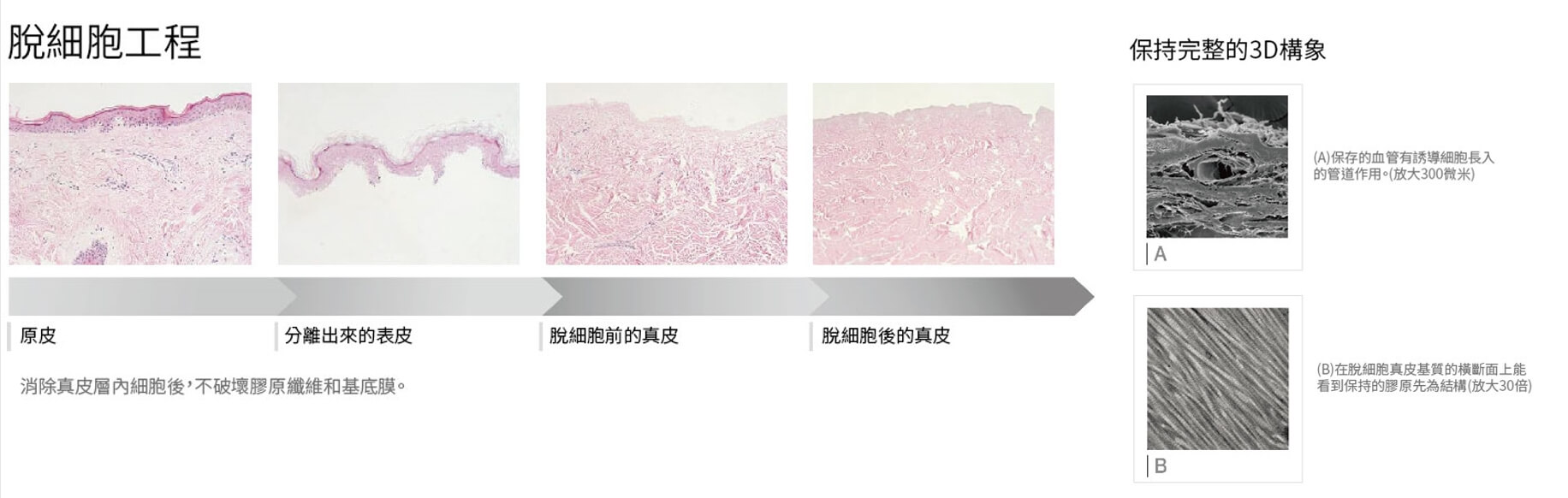 MegaDerm具有多款不同厚薄大小尺寸可供選擇,使其手術運用更廣泛,且經特殊專業處理可徹底消除組織的細胞及免疫排異因子,並且不損傷原膠原纖維、基底膜,完整保留3D結構,因此與組織相容性高,不易產生發炎排斥反應,還能助於促進植入後與自身細胞和血管的形成,可降低吸收率,安全提升耐久性。