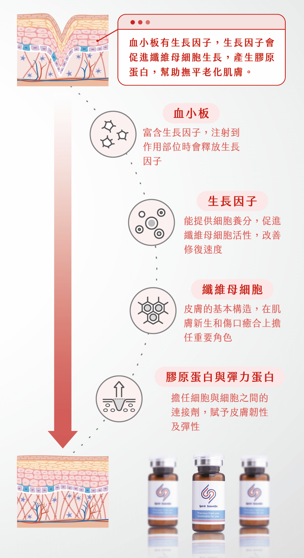 PLT凍晶修護–幫助雷射術後更快恢復俗話說愛美是女人的天性,但其實愛美的男性也不少。女性害怕歲月在臉上留下痕跡,男性則苦惱於青春痘造成的疤痕甚至月球表面。因此有些人會選擇使用雷射來處理細紋、毛孔粗大或是痘疤,而現在,有更新式的治療方法,藉由雷射後的PLT凍晶修護運用,讓膚質加速痊癒修復外,膚質的改善效果也能更加卓越。 院內案例 此案例為腹部妊娠紋複合式治療,透過Tixel提可塑熱力點陣治療,針對困擾紋路進行傳遞熱能並搭配PLT凍晶修護運用,讓膚質加速痊癒修復外,膚質的改善效果也能更加顯著。 療程介紹肌膚的膠原蛋白會隨著生活作息老化流失,除了透過輕微破壞肌膚的方式刺激組織新生,PLT凍晶修護的特性也開始被使用在組織修復上。PLT以往多用於復健或骨科領域,但由於富含成長因子,且不同於PRP,只需抽血一次便能於往後療程上使用,因此多用於肌膚雷射術後塗抹於傷口處,有助於傷口癒合與肌膚恢復改善。思必瑞特(Spirit Scientific)生技團隊研發PLT凍晶修護,以專利技術完整規劃PLT凍晶修護服務流程,突破舊有PRP限制,在肌膚新生和傷口癒合上擔任重要角色,讓血液維持最佳活性,並讓產品在室溫下保存三年,PLT凍晶修護能讓醫師更精準處理過去治療相對有極限的疾病或問題,也由於產品取於自身,不會有過敏問題,與其他療程做複合式療法更能幫助提升術後成果。在現今人人越來越重視膚質保養觀念的年代,皮膚保養還是首重保濕以及防曬,成分單純的保濕產品也可以減少乾燥造成的細紋,如何選對最適合自己的療程,讓保養與修復同步進行,才是通往無暇肌膚的最佳方法。 熟齡階段隱藏你看不到的危機 過了25歲,肌膚進入熟齡階段,皮膚細胞所分泌的生長因子會逐漸減少,導致膠原蛋白及彈力蛋白的生成受阻,若再加上外在不利因素而使得膠原蛋白及彈力蛋白持續受到破壞,則肌膚的支撐力將變得不足,於是漸漸失去彈性,皺紋、鬆弛等問題將會慢慢出現。 年輕的肌膚,富含大量且結構完整的膠原蛋白與彈力蛋白,隨著年齡增長、陽光曝曬和地心引力等因素,造成膠原蛋白流失,皮膚漸漸崩壞,由細小的紋路、斑點和鬆弛開始,肌膚逐漸顯老。 隨著科技進步,分離出成長因子的技術也日漸成熟,讓醫師更有機會精準處理疾病與問題。雷射後,用PLT塗抹可幫助傷口修復,縮短恢復期 血小板在臨床醫學或臨床文獻上有極廣範的應用: 【骨科/復建科】髖關節置換、膝關節置換、脊柱側彎修復、脊柱融合……等等。骨移植修復受傷細胞並緩解關節韌帶,肌肉,腱等發炎部位,特別是對於急慢性肌腱問題,以及韌帶和肌肉受傷症狀。主要用於肩膀,手腕,肘部,膝蓋和腳踝。例如網球肘、跟腱炎、腕管綜合症,類風濕關節炎,痛風等。PLT也適用於運動傷害,它可以加速血管細胞和膠原纖維的修復,加強癒合效果。 【外科】植皮、植骨、金屬植入、組織擴張……等等。顏面骨折重建燒傷治療,大幅縮短了治療時間、降低感染風險。改善部分皮層植皮手術(STSG),治療足部潰傷、褥瘡和燒傷創面等等。 【皮膚科/美容醫學】除皺、緊致拉提、改善凹陷痘疤、改善肌膚紋路、淡化黑色素斑點、自體脂肪移植……等等。加速表皮細胞、上皮細胞的成長,提高再生能力,大幅縮短恢復時間,提高恢復治療的療效,並提升皮膚雷射後的效果,改善皮膚紋理和彈性,增加纖維母細胞的數量、撫平皺紋、痘疤,並緊緻與拉提臉部肌膚,或平滑妊娠紋的輔助改善。 醫師受訪 第46屆台灣皮膚科醫學年會,於11/13~11/15在高雄展覽館正式展開,邀請國內外專家學者,於疾病治療、美容醫學領域交流新技術的應用與實作經驗。隨著醫療科技日新月異,肌膚的治療與保養有更多新方法,再生醫學於皮膚修復上的應用,也逐漸成為醫療下個階段發展的重點。現今國外亦有越來越多文獻指出血小板Platelet- Lyophilized Treatment (PLT)對皮膚改善與修復的幫助,更有生技公司將血小板凍晶化,藉此去除多餘血液雜質,以更大限度的方式釋放生長因子的效益,使肌膚治療更精準、效果更顯著。 影片分享 常見問與答 PLT凍晶修護是什麼 PLT成長因子凍晶,突破舊有PRP治療限制,具有定劑定量、安全、可靈活運用且可於室溫下存放3年之特性。 PLT是一項個人化的血小板離心純化服務,包括從診所採集血液標本、血小板純化、血小板凍乾、真空密封、伽馬射線滅菌和生長因數定量,所有這些操作均在無菌實驗室中進行,並在診所抽血與治療。 術後保養須知 PLT治療術後的主要在患部的保護,由於PLT塗抹於傷口,在外觀上較沒有影響,可以的話避免刺激性食物,以及三天內避免菸酒檳榔等,並遵從醫囑照顧即可。 越L’EXCELLENCE提醒您:此文章圖文內容僅使用於醫療資訊傳播用途,以上內容所刊登照片皆為院內實際治療經驗內容,並經本人同意使用。此外,任何療程皆有其風險,且成效因人而異,實際治療內容與改善程度請與醫師面對面評估。