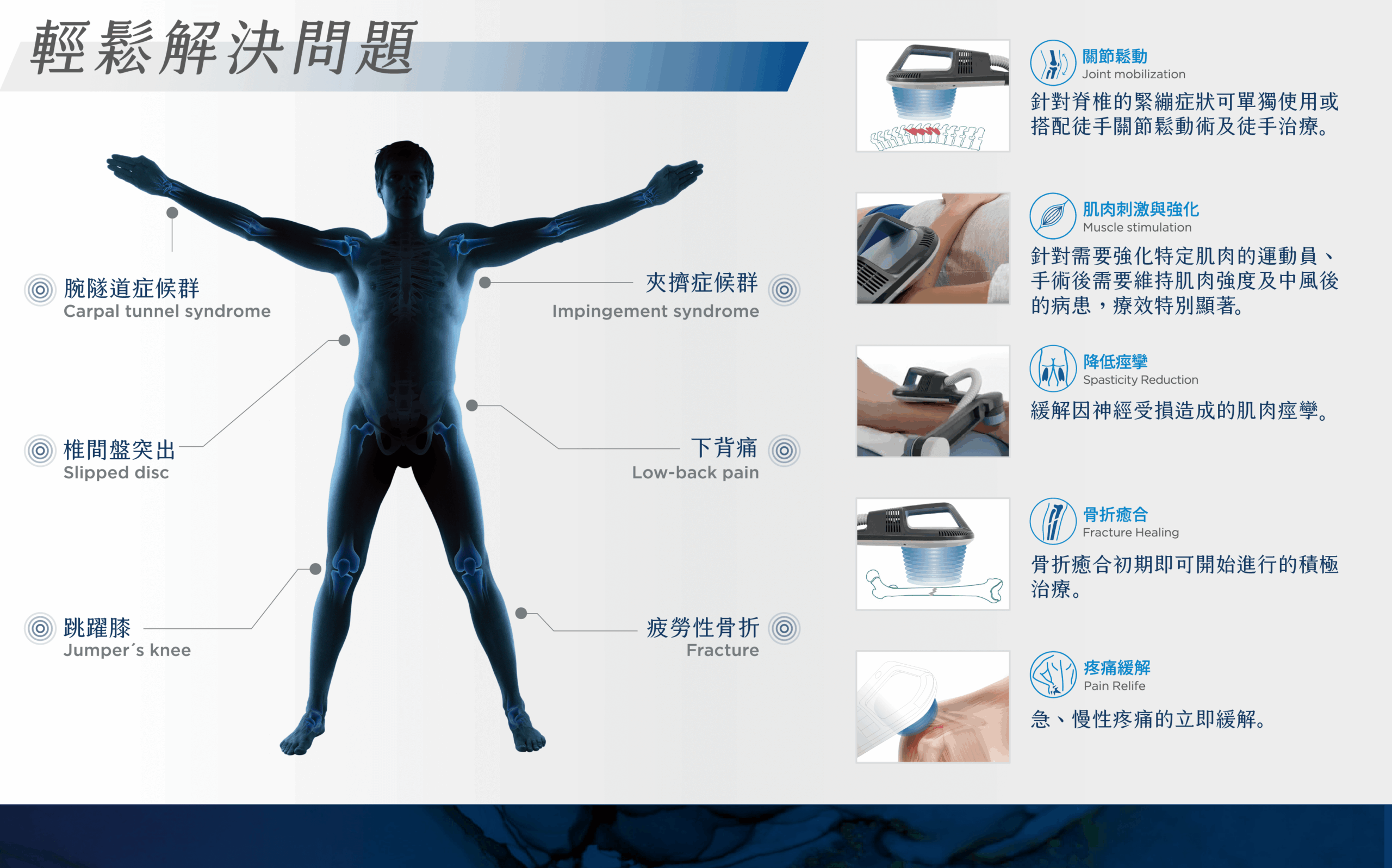 腕隧道症候群、關節夾擠症候群、椎間盤突出、急、慢性鎮痛、下背痛、跳躍膝、 骨折、特定肌肉強化、神經再生、痙攣、關節緊繃、中風後復建